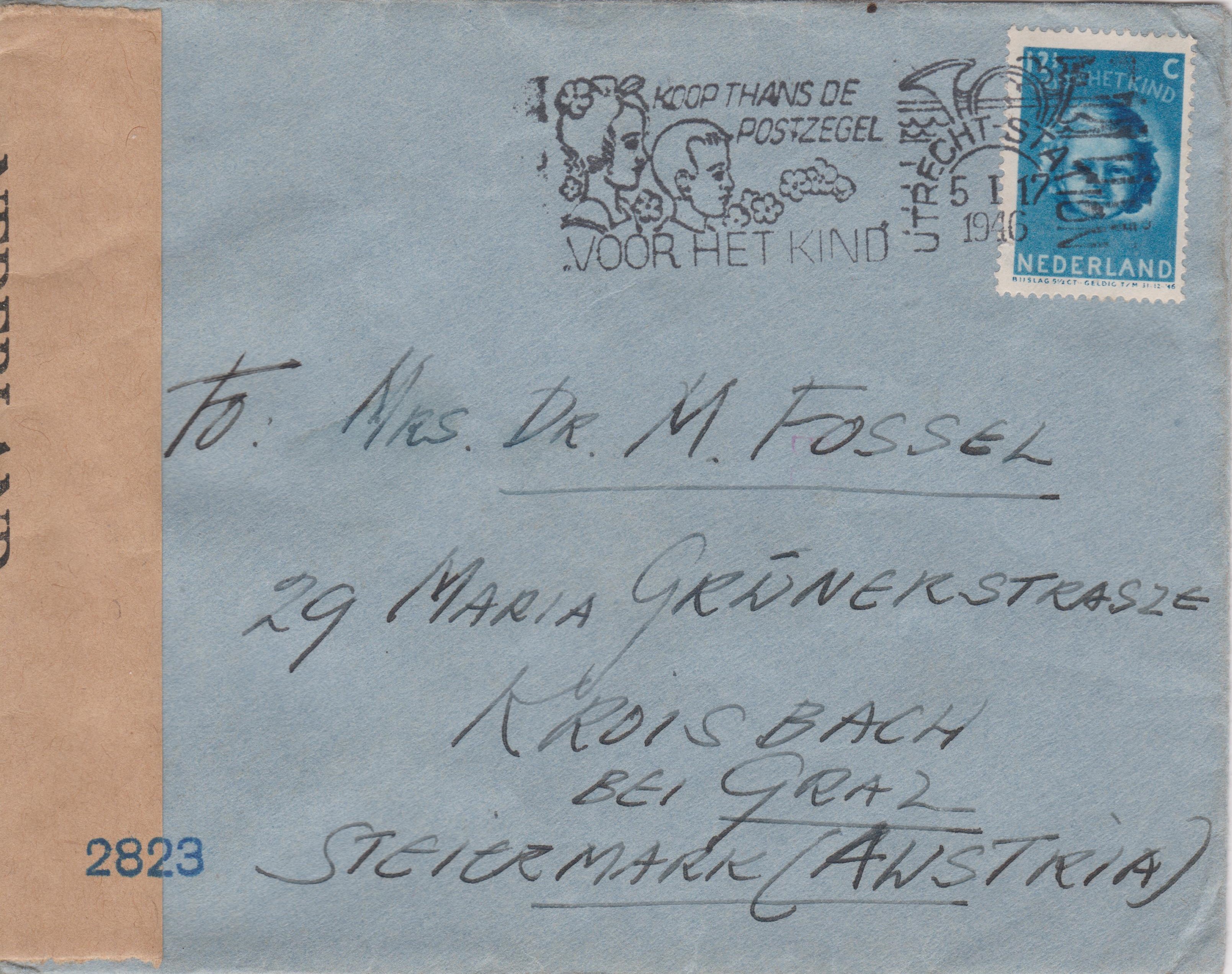Brief adressiert nach "GRAZ STEIERMARK(AUSTRIA)", aufgegeben am 05.01.1946 in UTRECHT, freigemacht per Einzelfrankatur 12 1/2 C VOOR HET KIND, entwertet per Maschinenstempel mit thematisch zum Postwertzeichen passenden Werbeeinsatz KOOP THANS DE POSTZEGEL VOOR HET KIND: