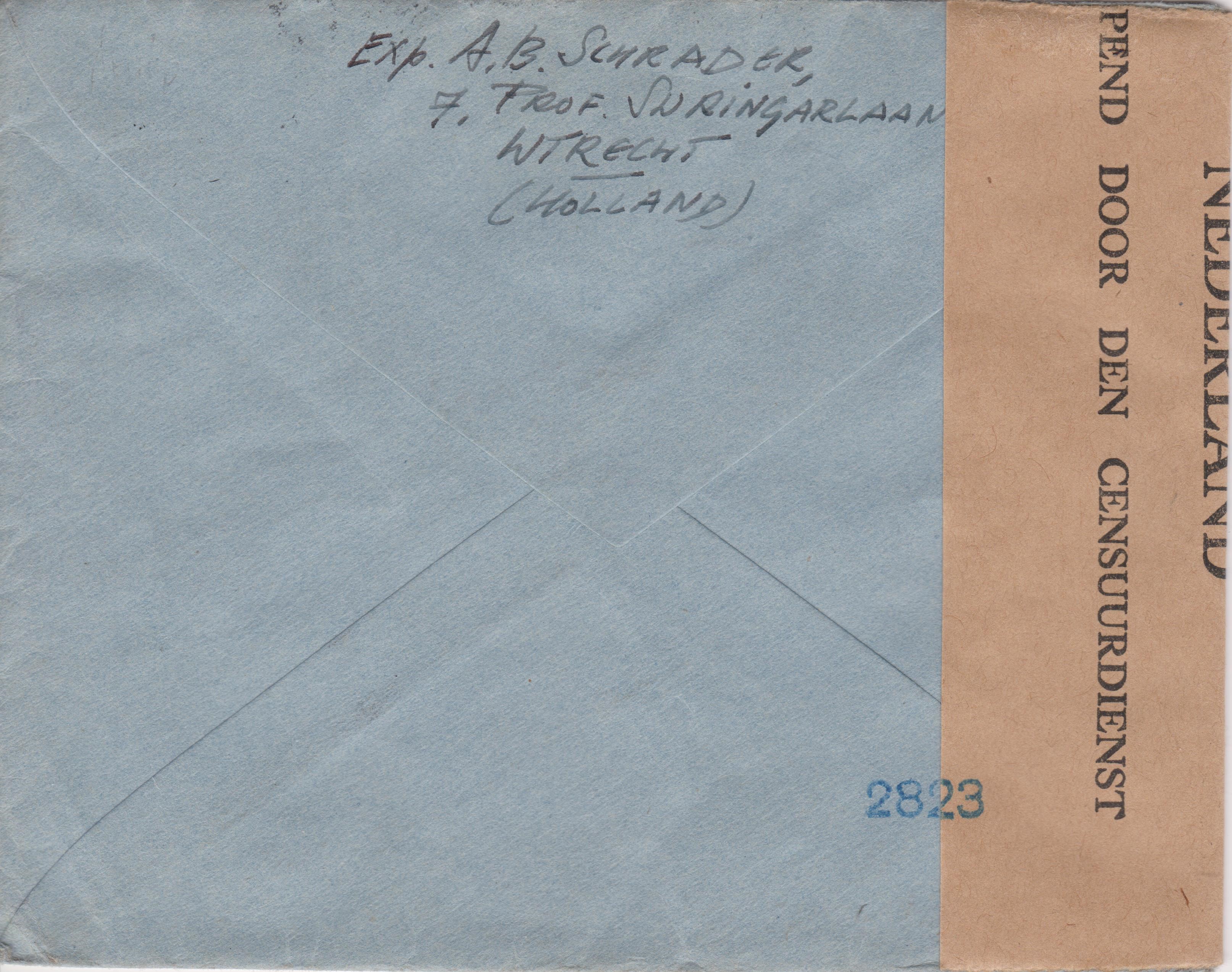 Der Beleg lief in den Niederlanden durch die Zensur, wo er linksseitig geöffnet und nach erfolgter Prüfung mit einem Verschlußzettel NEDERLAND OPEND DOOR DEN CENSUURDIENST wieder verschlossen wurde, was ein vorderseitig sowie rückseitig abgeschlagener Prüferstempel "2823" dokumentiert: