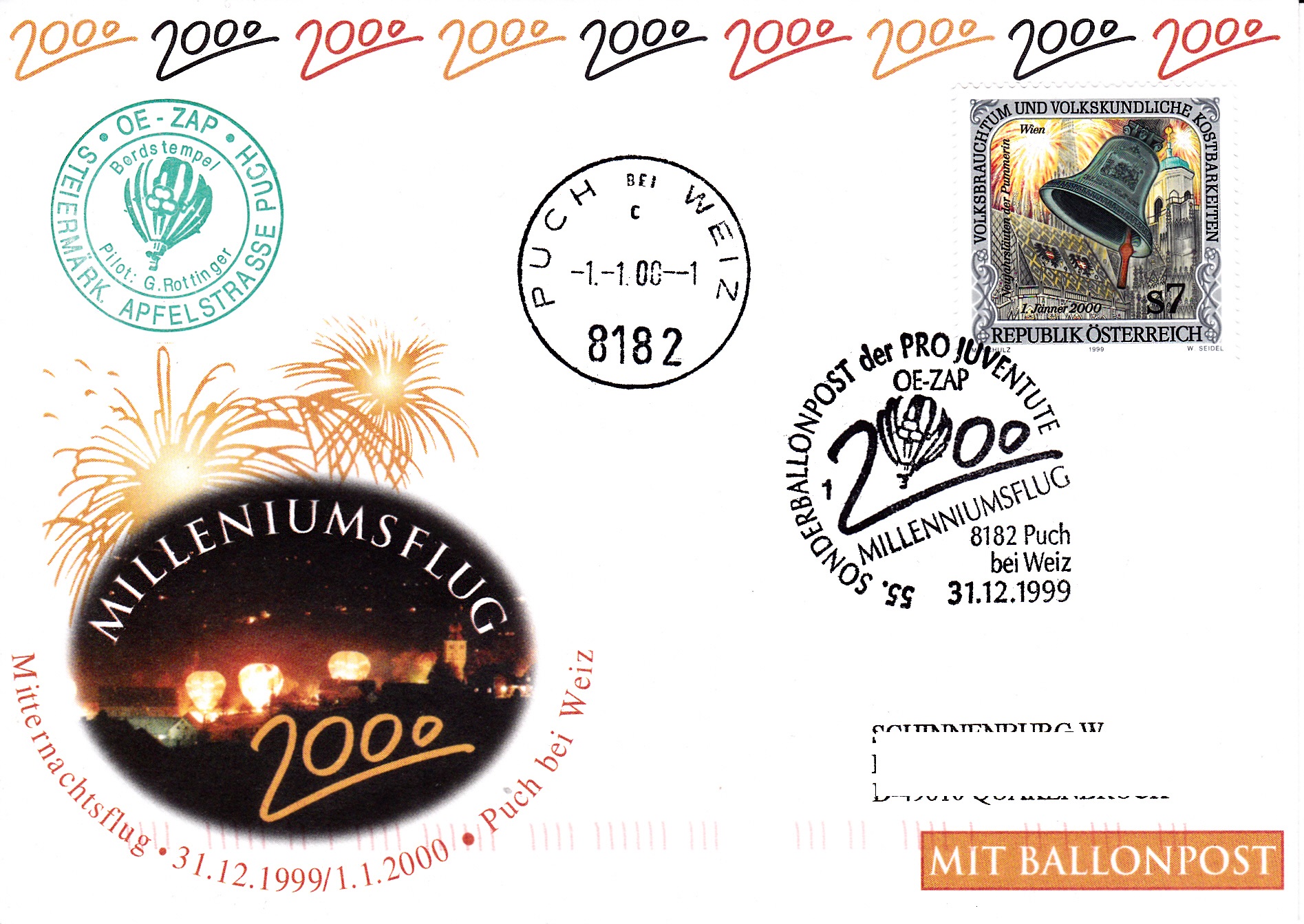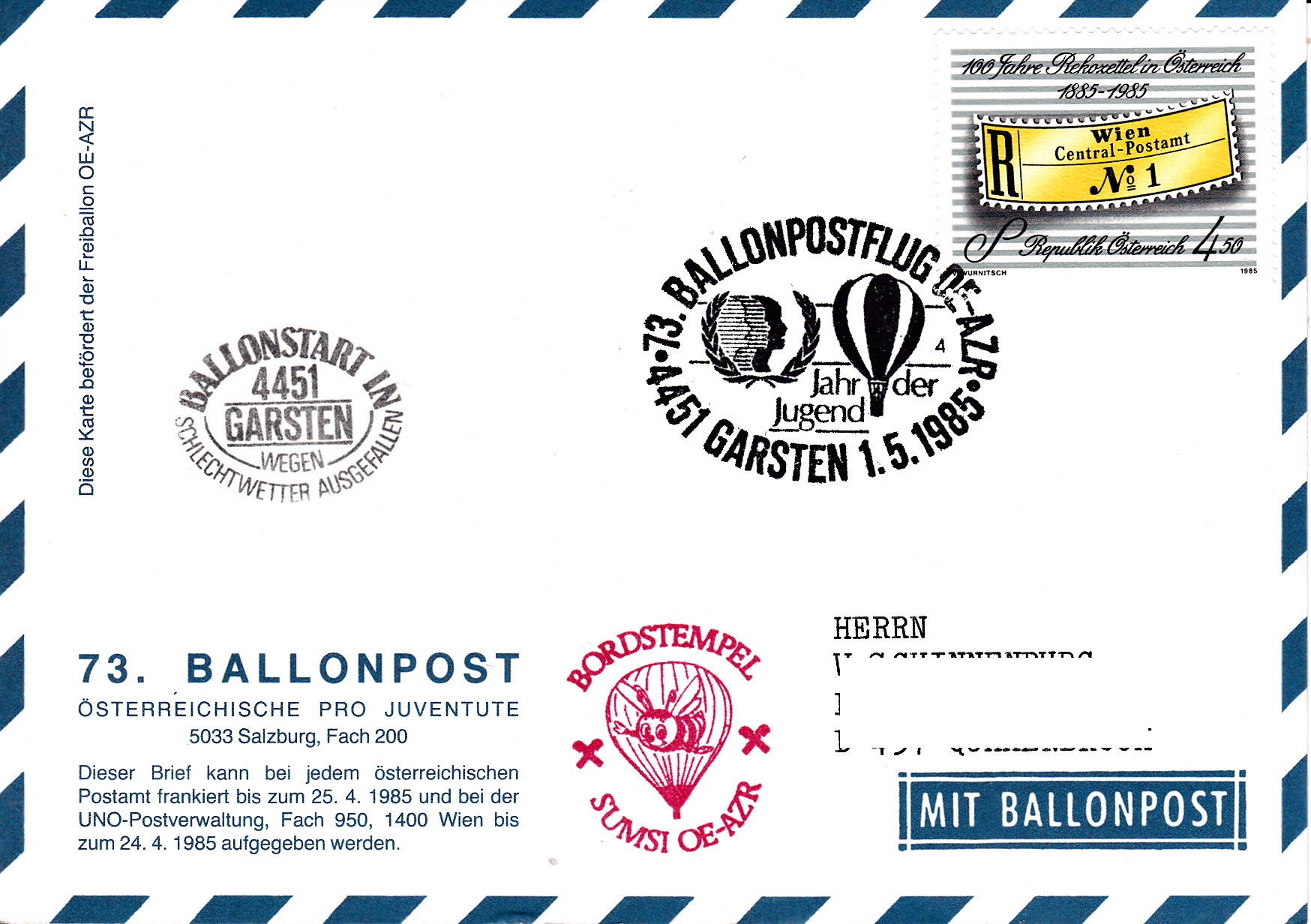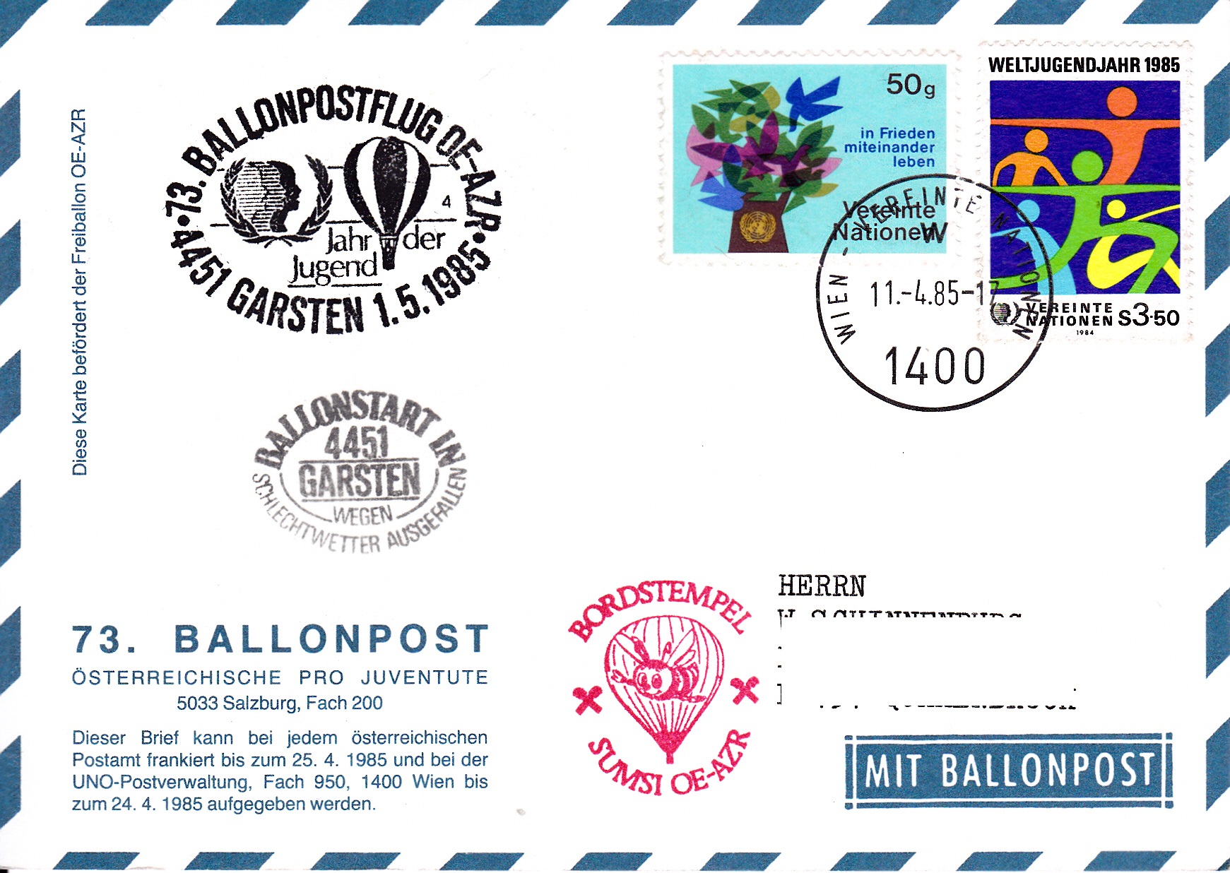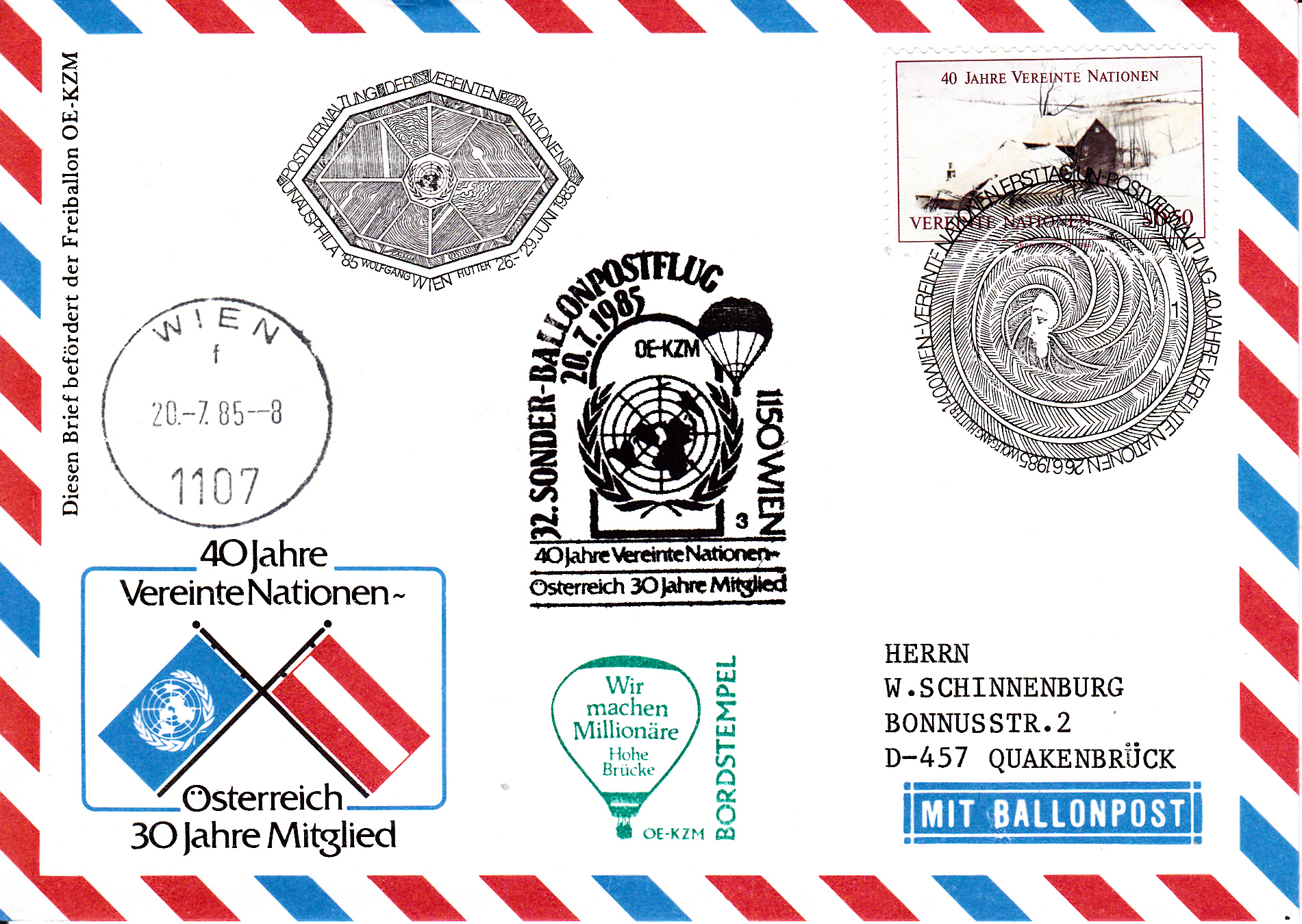 Dieser Brief wurde am Ersttag (26.6.1985) der Marke "40 Jahre Vereinte Nationen (UNO)" der UN-Postverwaltung Wien (MiNr 51 A) bei der Briefmarkenausstellung UNAUSPHILA'85 für den 32. Sonder-Ballonpostflug der Österreichischen Pro Juventute mit einem Ersttagsonderstempel zur Ausstellung mit der Kennziffer "1" gestempelt und am 20.7.1985 mit dem Freiballon OE-KZM befördert. Bei der Ausstellung wurde auch der Cachet-Stempel der UN-Postverwaltung Wien zur UNAUSPHILA'85 zusätzlich angebracht. Der Brief erhielt am 20.7.1985 einen Tagesstempel Wien Kennbuchstabe "f", den Sonderstempel zum 32. Sonder-Ballonpostflug mit der Kennziffer "3" und einen Bordstempel.