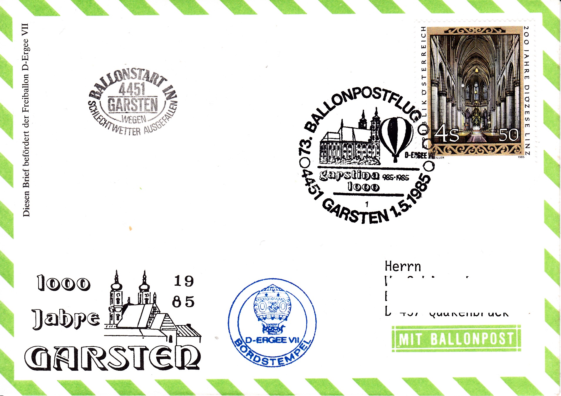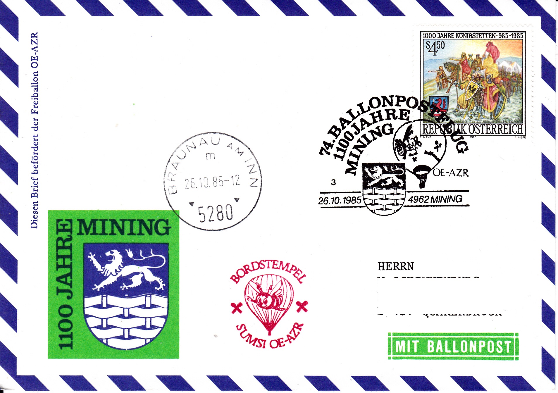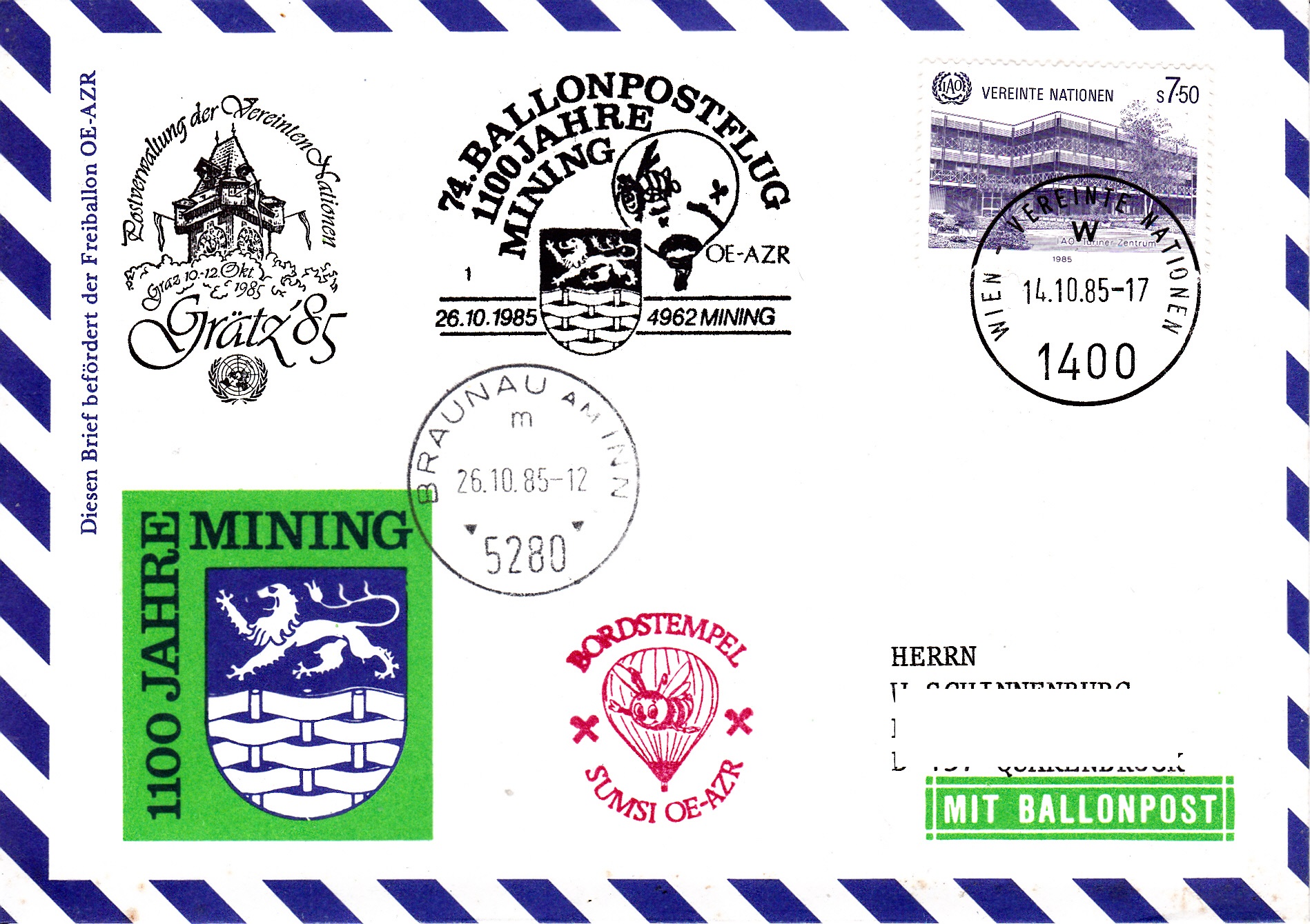 Dieser Brief wurde am 14.10.1985 bei der UN-Postverwaltung Wien für den 74. Ballonpostflug der Österreichischen Pro Juventute mit dem Ballon SUMSI OE-AZR aufgegeben und mit dem Tagesstempel mit dem Kennbuchstaben "w" gestempelt. Am 326.10.1985 wurde er mit dem Ballon OE-ZMR Xerox befördert. Er erhielt an diesem Tag den Sonderstempel aus Mining mit der Kennziffer "1" zu diesem 74. Ballonpostflug, einen Tagesstempel aus Braunau am Inn mit dem Kennbuchstaben "m" und einen Bordstempel.