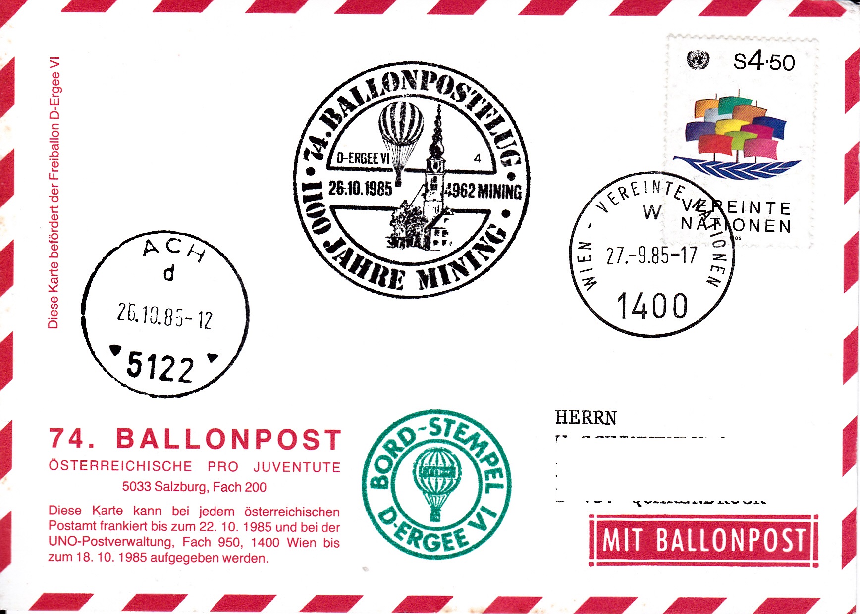 Diese Karte wurde am 27.9.1985 bei der UN-Postverwaltung Wien für den 74. Ballonpostflug der Österreichischen Pro Juventute mit dem Ballon D-ERGEE VI aufgegeben und mit dem Tagesstempel mit dem Kennbuchstaben "w" gestempelt. Am 26.10.1985 wurde sie mit dem Ballon D-ERGEE VI befördert. Die Karte erhielt an diesem Tag den Sonderstempel aus Mining mit der Kennziffer "4" zu diesem 74. Ballonpostflug, einen Tagesstempel aus Ach mit dem Kennbuchstaben "d" und einen Bordstempel.