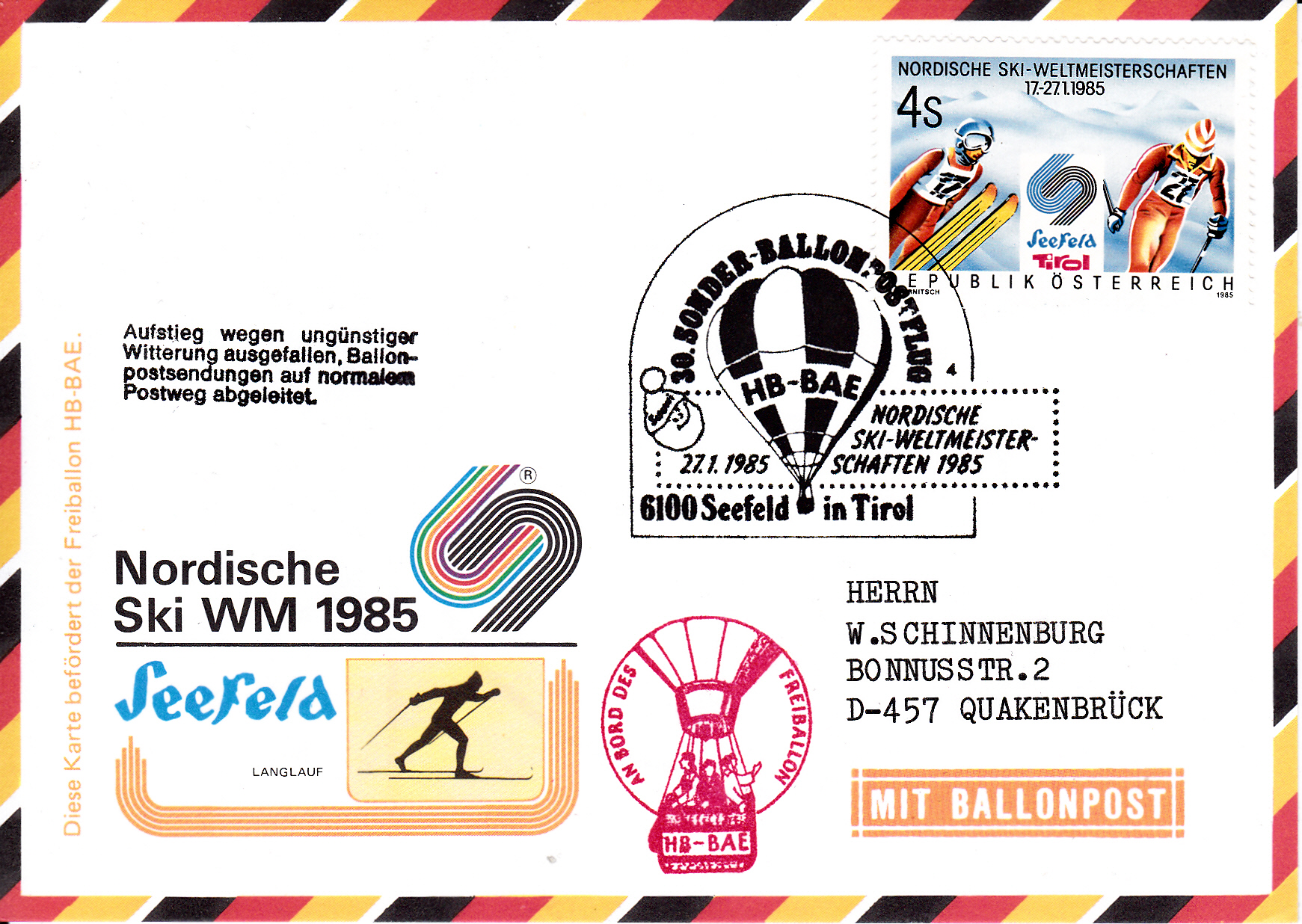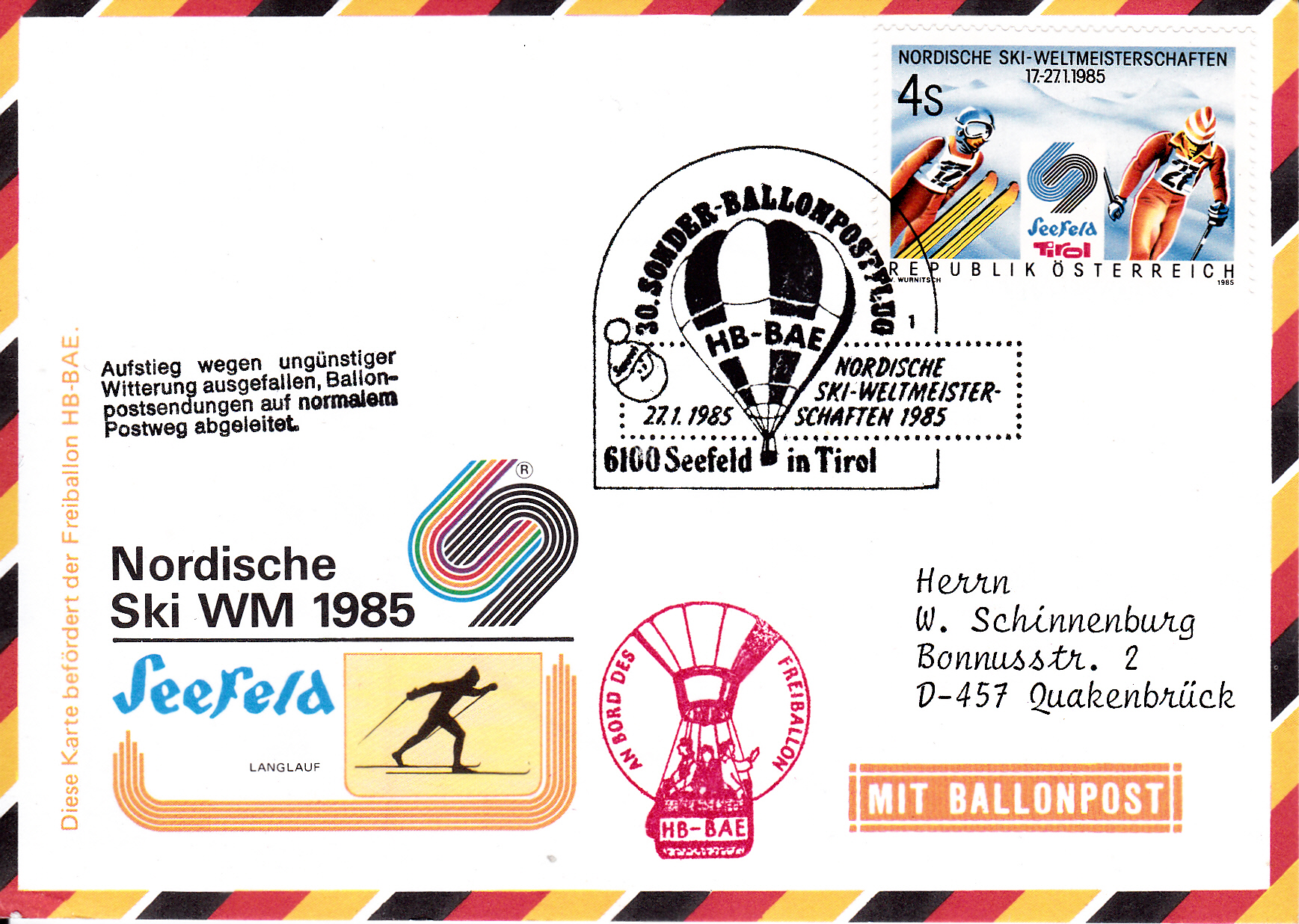 Diese Karte wurde am 27.1.1985 bei der Nordischen Ski WM 1985 für den 30. Sonder-Ballonpostflug der Österreichischen Pro Juventute mit dem Freiballon HB-BAE aufgegeben. Er wurde mit dem Sonderstempel aus Seefeld in Tirol mit der Kennziffer "1" zu diesem Ballonflug gestempelt. Die Karte erhielt einen Bordstempel und, da der Ballonflug wegen ungünstiger Witterungsverhältnissen ausgefallen ist, einen "Ausfallstempel".