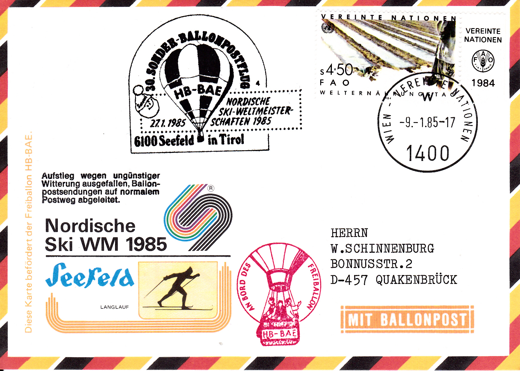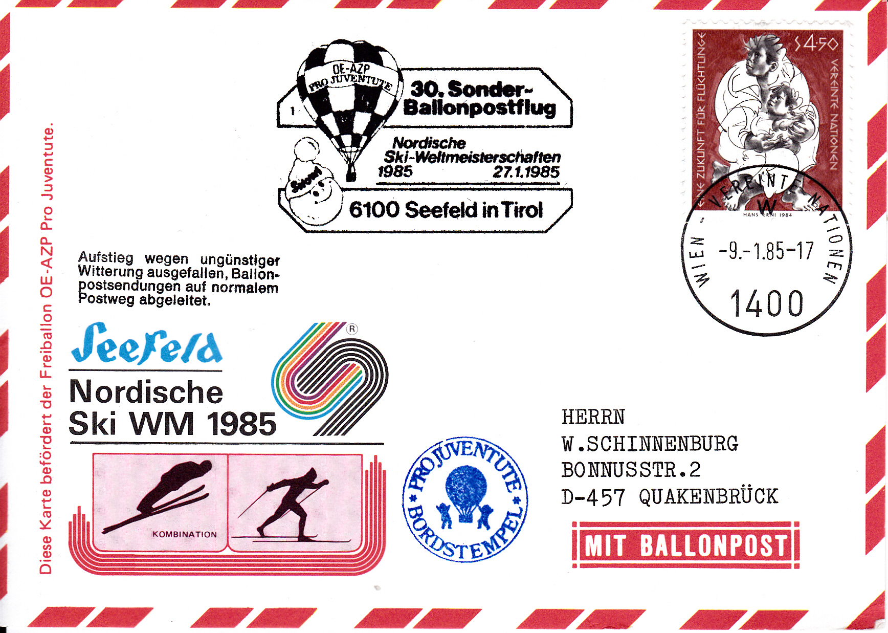 Diese Karte wurde am 9.1.1985 bei der UN-Postverwaltung Wien für den 30. Sonder-Ballonpostflug der Österreichischen Pro Juventute mit dem Freiballon HB-BAE aufgegeben und mit dem Tagesstempel mit dem Kennbuchstaben "w" gestempelt und sollte am 27.1.1985 mit dem Ballon HB-BAR befördert werden. Die Karte erhielt an diesem Tag den Sonderstempel aus Seefeld in Tirol mit der Kennziffer "1" zu diesem 30. Sonder-Ballonpostflug. Die Karte erhielt auch einen Bordstempel und, da der Ballonflug wegen ungünstiger Witterungsverhältnissen ausgefallen ist, einen "Ausfallstempel".