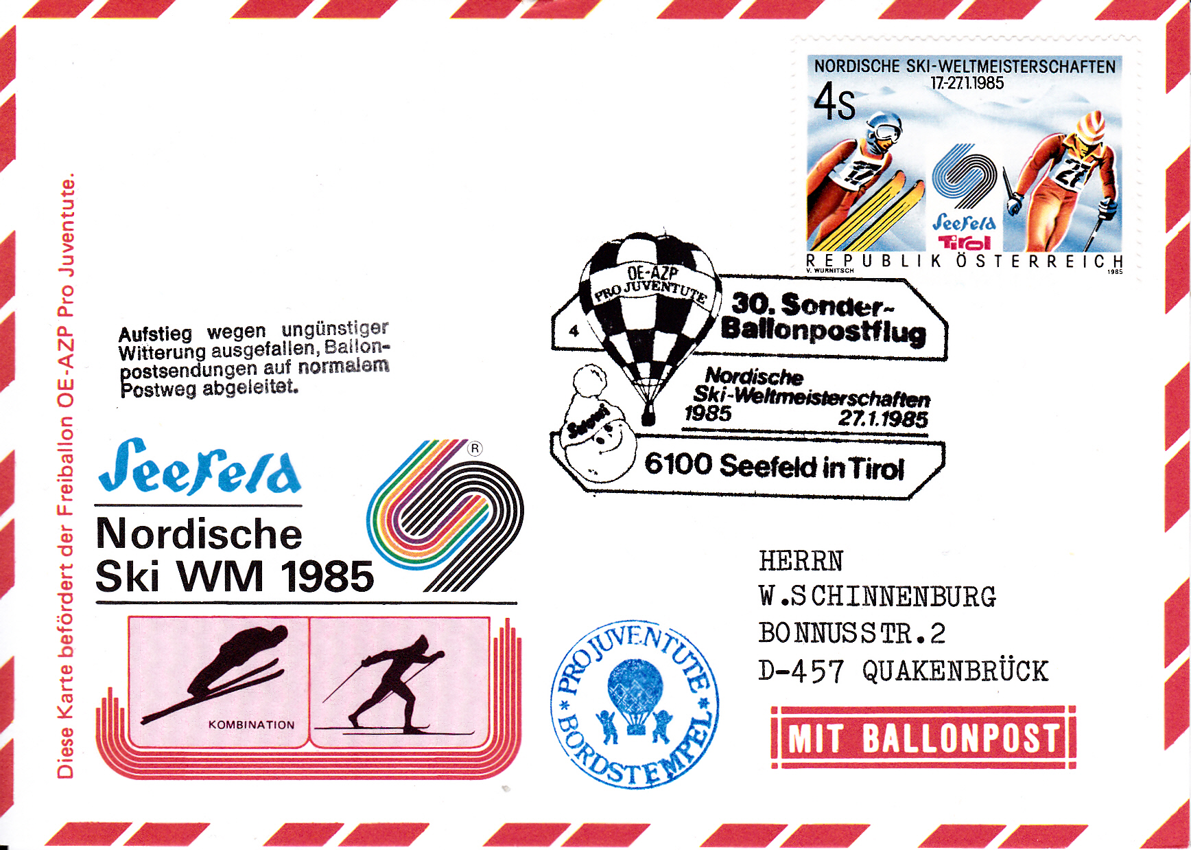 Diese Karte wurde am 27.1.1985 bei der Nordischen Ski WM 1985 für den 30. Sonder-Ballonpostflug der Österreichischen Pro Juventute mit dem Ballon OE-AZP PRO JUVENTUTE aufgegeben. Er wurde mit dem Sonderstempel aus Seefeld in Tirol mit der Kennziffer "4" zu diesem Ballonflug gestempelt. Die Karte erhielt einen Bordstempel und, da der Ballonflug wegen ungünstiger Witterungsverhältnissen ausgefallen ist, einen "Ausfallstempel".