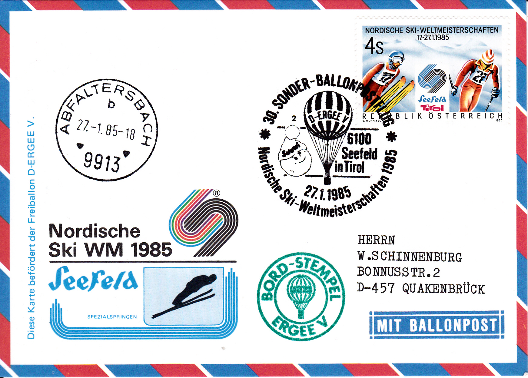 Diese Karte wurde am 27.1.1985 bei der Nordischen Ski WM 1985 für den 30. Sonder-Ballonpostflug der Österreichischen Pro Juventute mit dem Ballon ERGEE V aufgegeben. Sie wurde mit dem Sonderstempel aus Seefeld in Tirol mit der Kennziffer "2" zu diesem Ballonflug gestempelt und wurde am gleichen Tag mit dem Ballon ERGEE V befördert. Sie erhielt zusätzlich einen Tagesstempel Abfaltersbach mit dem Kennbuchstaben "b" und einen Bordstempel.