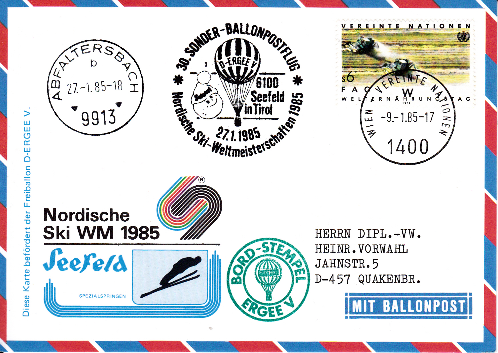 Diese Karte wurde am 9.1.1985 bei der UN-Postverwaltung Wien für den 30. Sonder-Ballonpostflug der Österreichischen Pro Juventute mit dem Ballon ERGEE V aufgegeben und mit dem Tagesstempel mit dem Kennbuchstaben "w" gestempelt und wurde am 27.1.1985 mit dem Ballon ERGEE V befördert. Die Karte erhielt an diesem Tag den Sonderstempel aus Seefeld in Tirol mit der Kennziffer "1" zu diesem 30. Sonder-Ballonpostflug. Die Karte erhielt auch einen Bordstempel und einen Tagesstempel Abfaltersbach mit dem Kennbuchstaben "b".