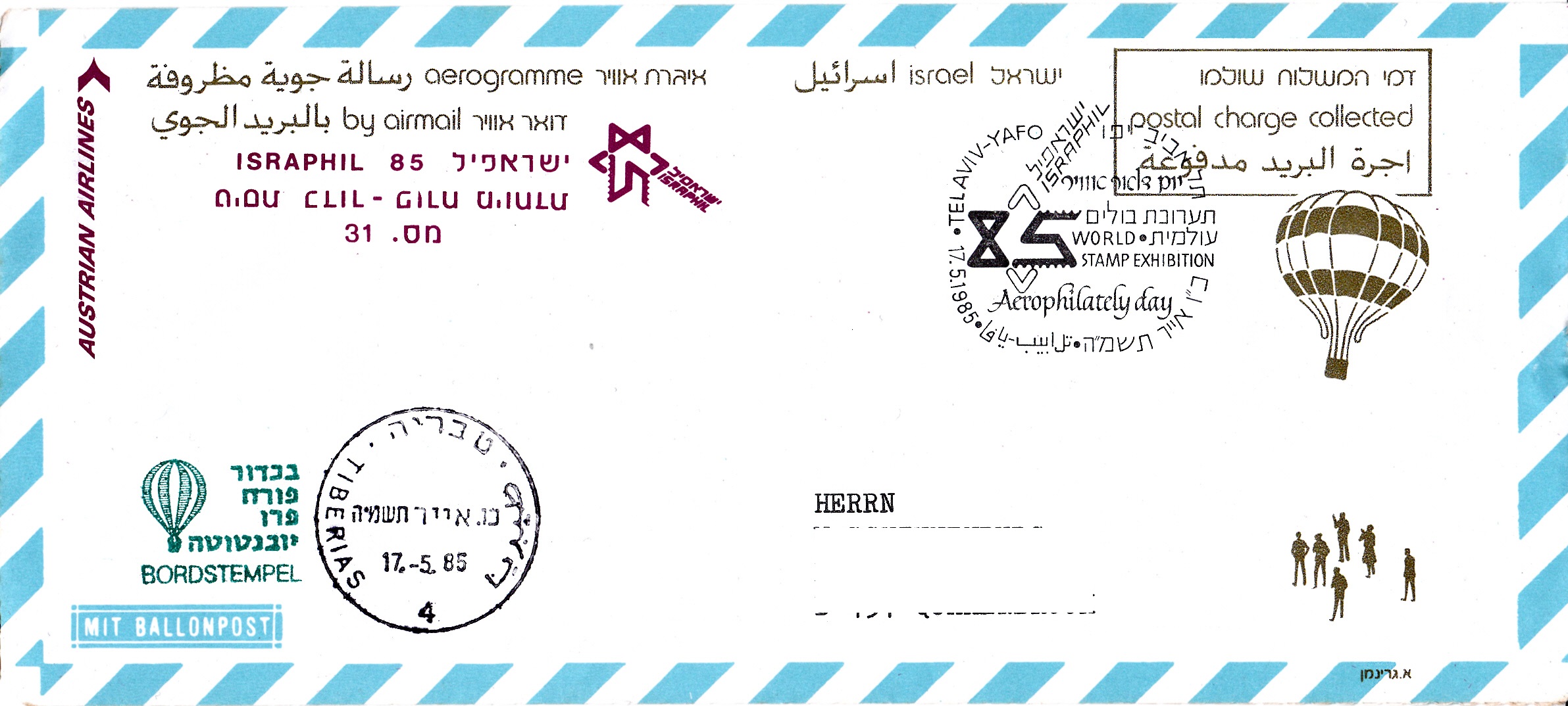 Der 49. Sonder-Ballonpostflug der Österreichischen Pro Juventute mit dem Ballon PRO JUVENTUTE fand am 17.5.1985 in Tel Aviv-Yafo statt als 1. Ballonpostflug in Israel statt. Dieses Aerogramm wurde bei der ISRAPHIL 85 zur Beförderung mit dem Ballon eingeliefert und mit dem Sonderstempel zum "Tag der Aerophilatelie" am 17.5. gestempelt und mit dem Ballon befördert. Er erhielt noch am gleichen Tag einen Tagesstempel aus Tiberias mit der Kennziffer "4" und einen Bordstempel.