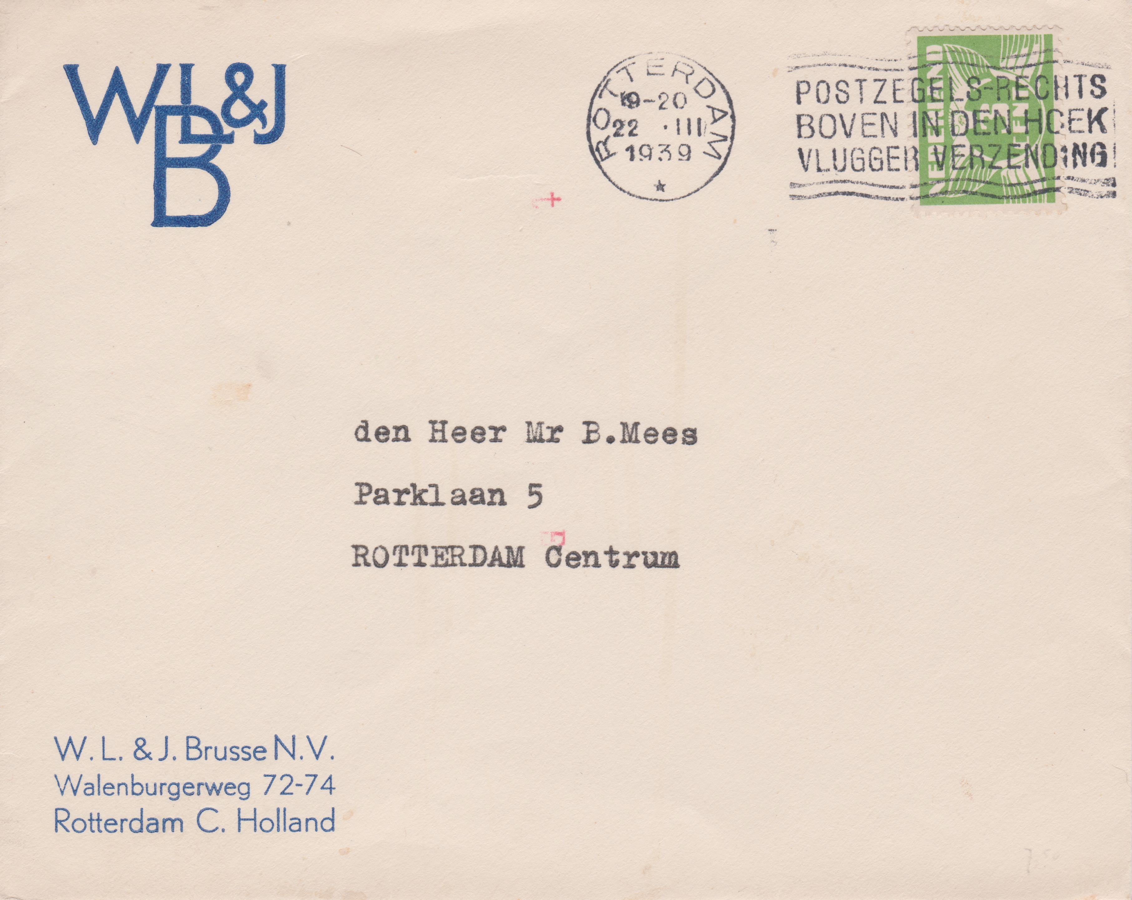 Dieser Brief durchlief in Rotterdam die TRANSORMA und erhielt einen Transorma-Stempel "L":