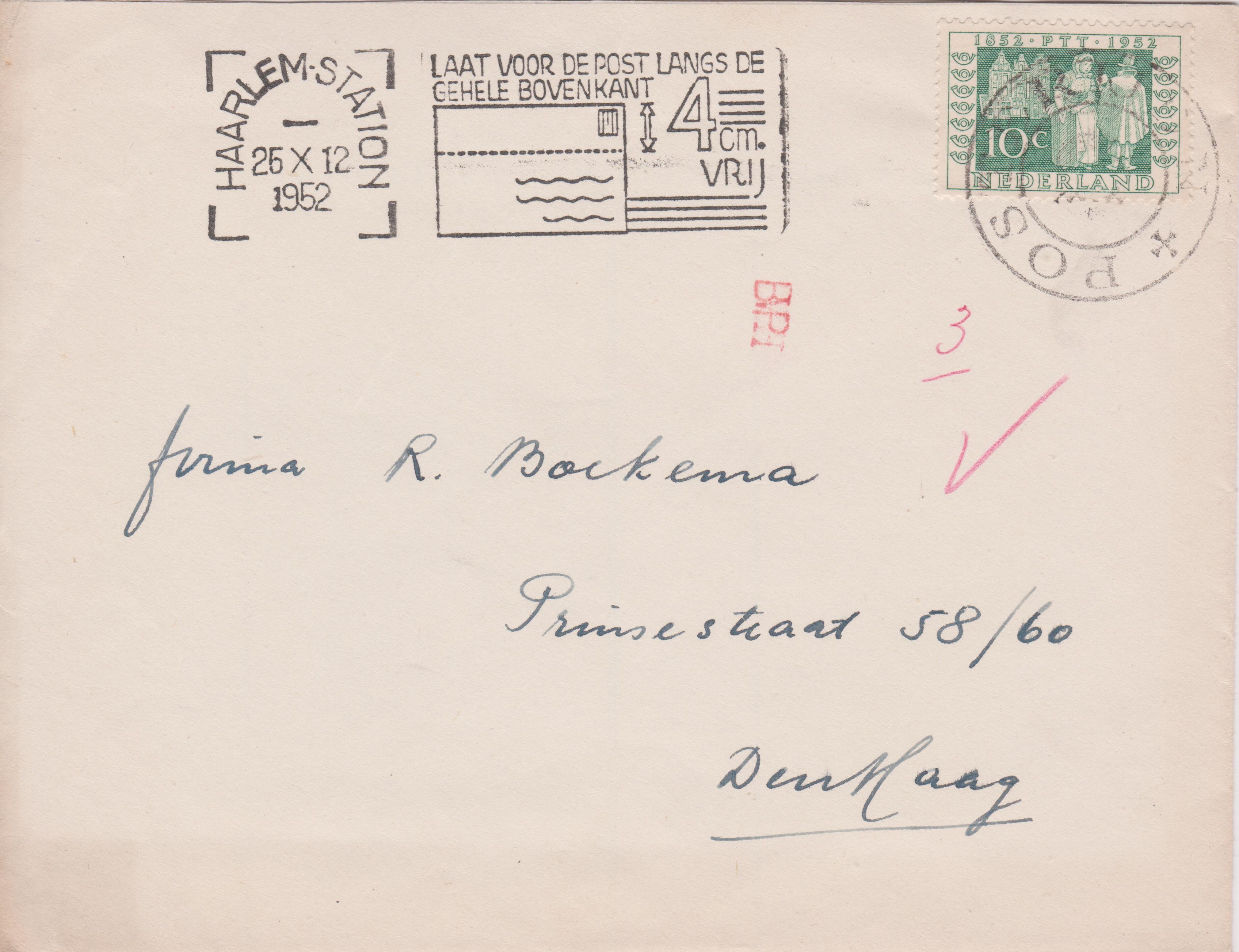 Brief, adressiert nach Den Haag, aufgegeben am 26.10.1952 in HAARLEM STATION: