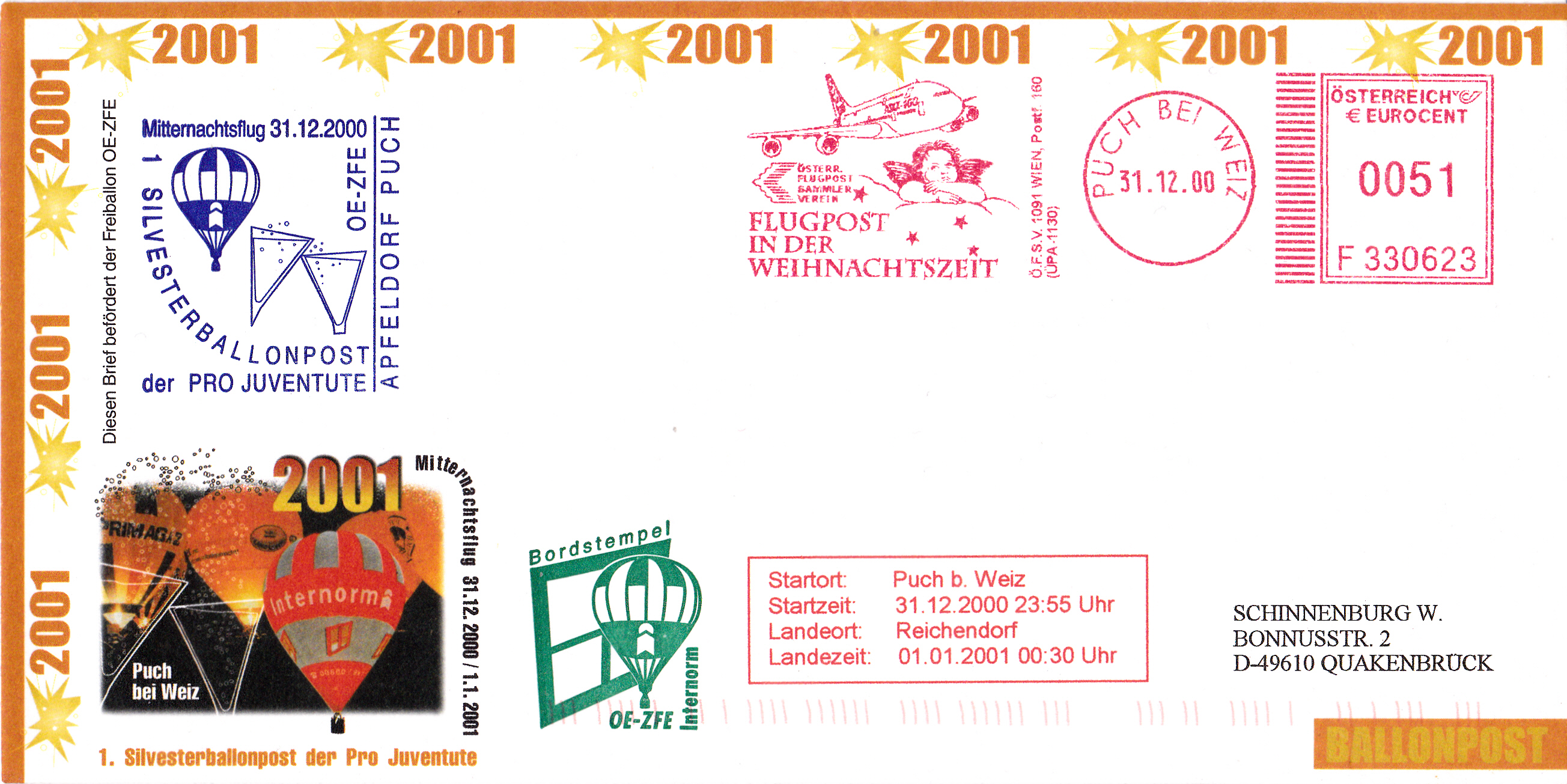 Dieser Brief mit einem Freistempel des Österreichischen Flugpostsammlervereins zu 0051 Cent frankiert und am 31.12.2000 von Puch bei Weiz nach Reichendorf mit dem Ballon IE-ZFE bei einem Mitternachtflug als "1. Silvesterballonpost" befördert.