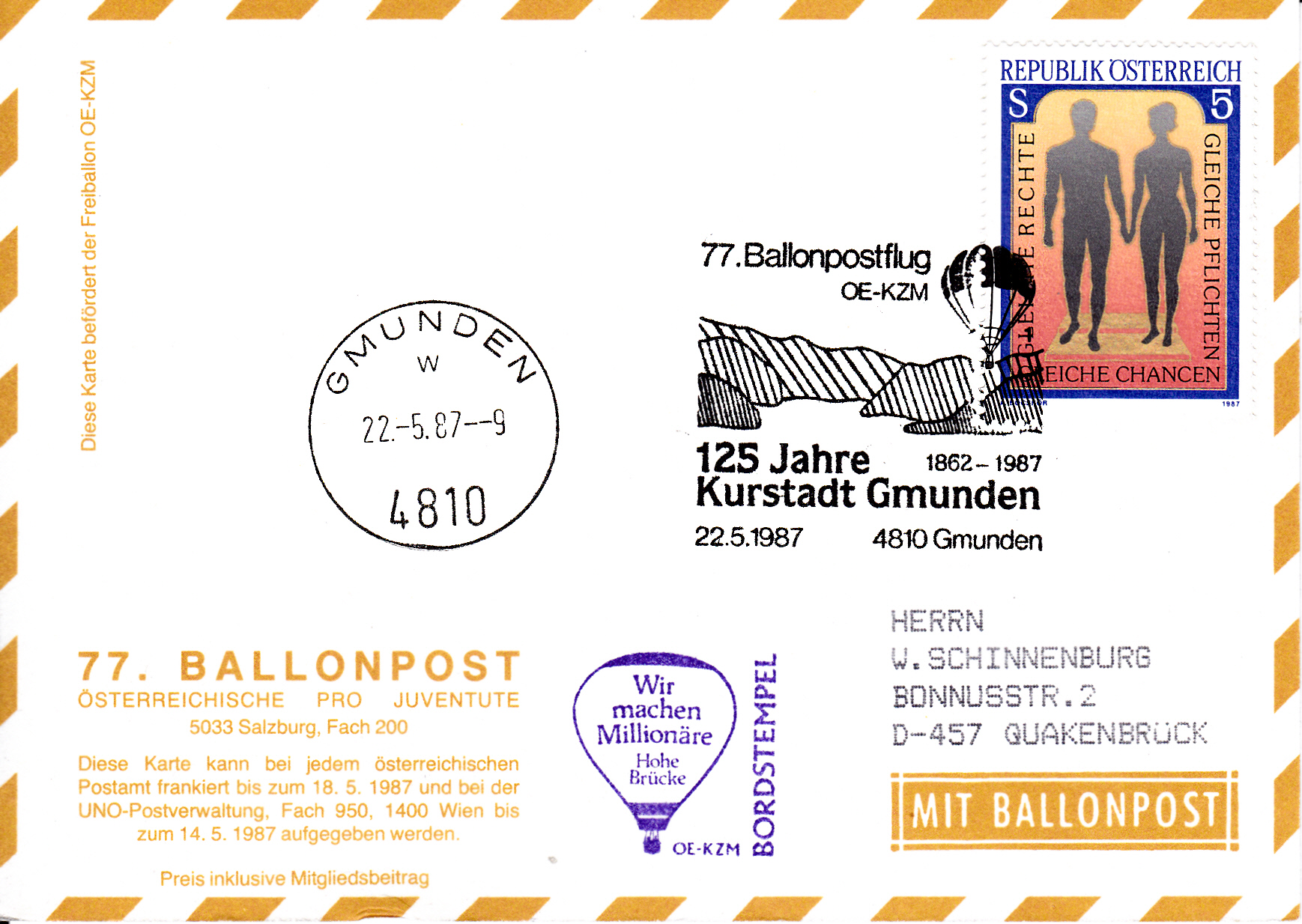 Diese Karte wurde am 22.5.1987 in Gmunden für den 77. Ballonpostflug der Österreichischen Pro Juventute mit dem Freiballon OE-KZM aufgegeben. Sie erhielt den Sonderstempel mit der Kennziffer "1" aus Gmunden zu diesem Ballonflug und wurde am gleichen Tag mit dem Freiballon OE-KZM befördert. Sie erhielt zusätzlich einen Bordstempel und einen Tagesstempel aus Gmunden mit dem Kennbuchstaben "w".