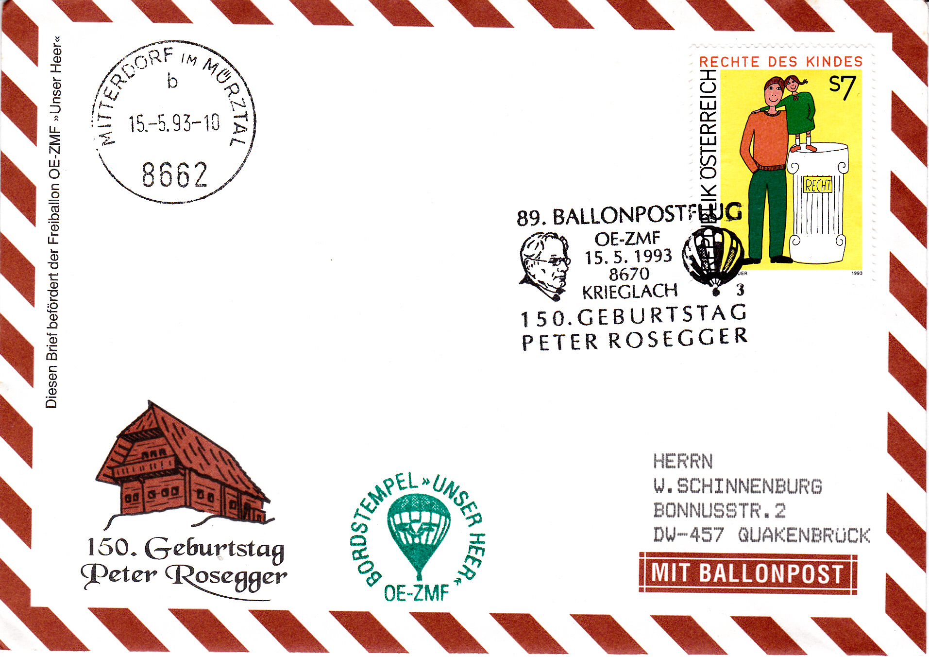 Dieser Brief wurde am 15.5.1993 in Krieglach für den 89. Ballonpostflug der Österreichischen Pro Juventute mit dem Freiballon OE-ZMF aufgegeben. Er erhielt den Sonderstempel mit der Kennziffer "3" aus Krieglach zu diesem Ballonflug und wurde am gleichen Tag mit dem Freiballon OE-ZMF befördert. Er erhielt zusätzlich einen Tagesstempel Mitterdorf im Mürztal mit dem Kennbuchstaben "b" und einen Bordstempel.