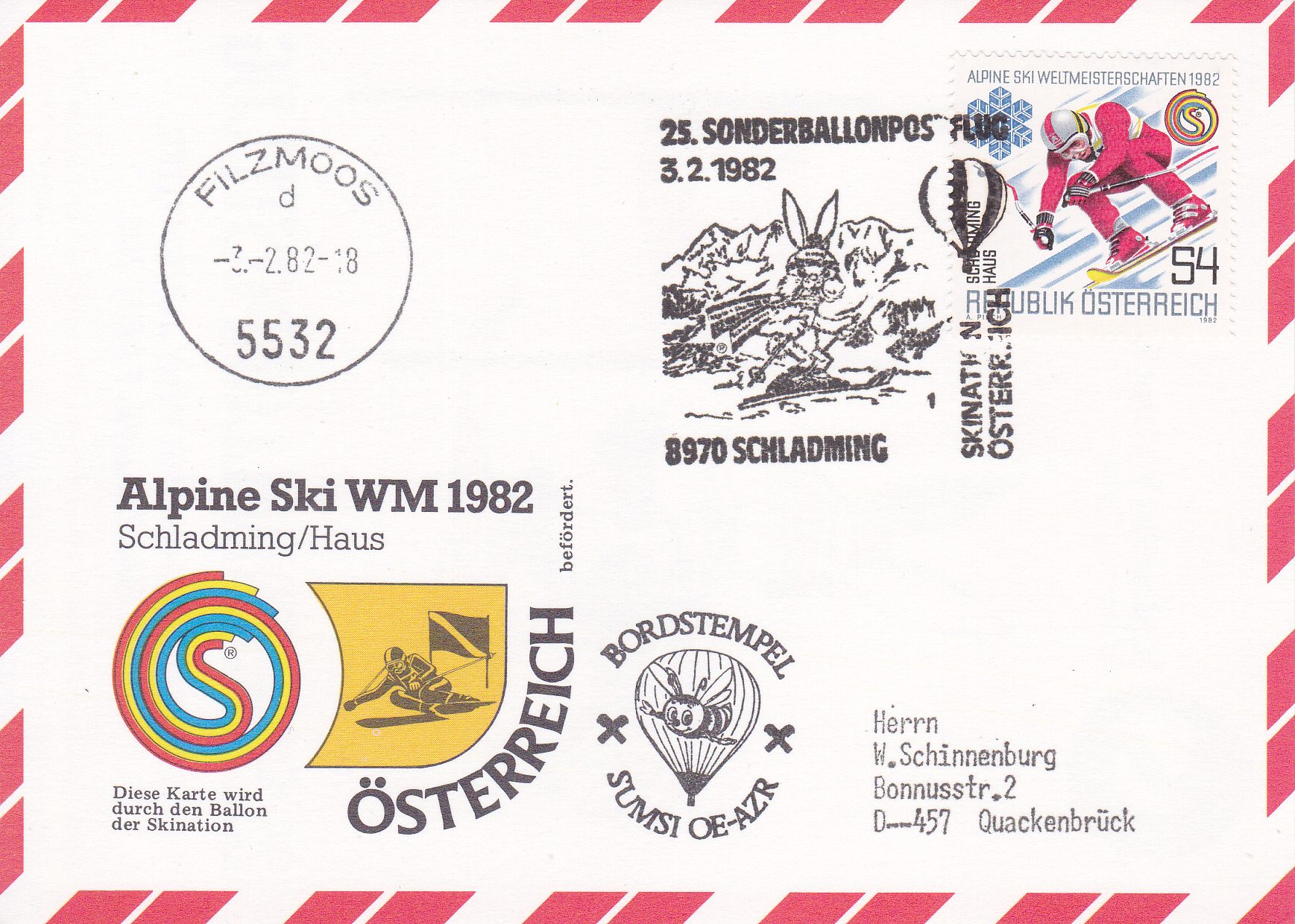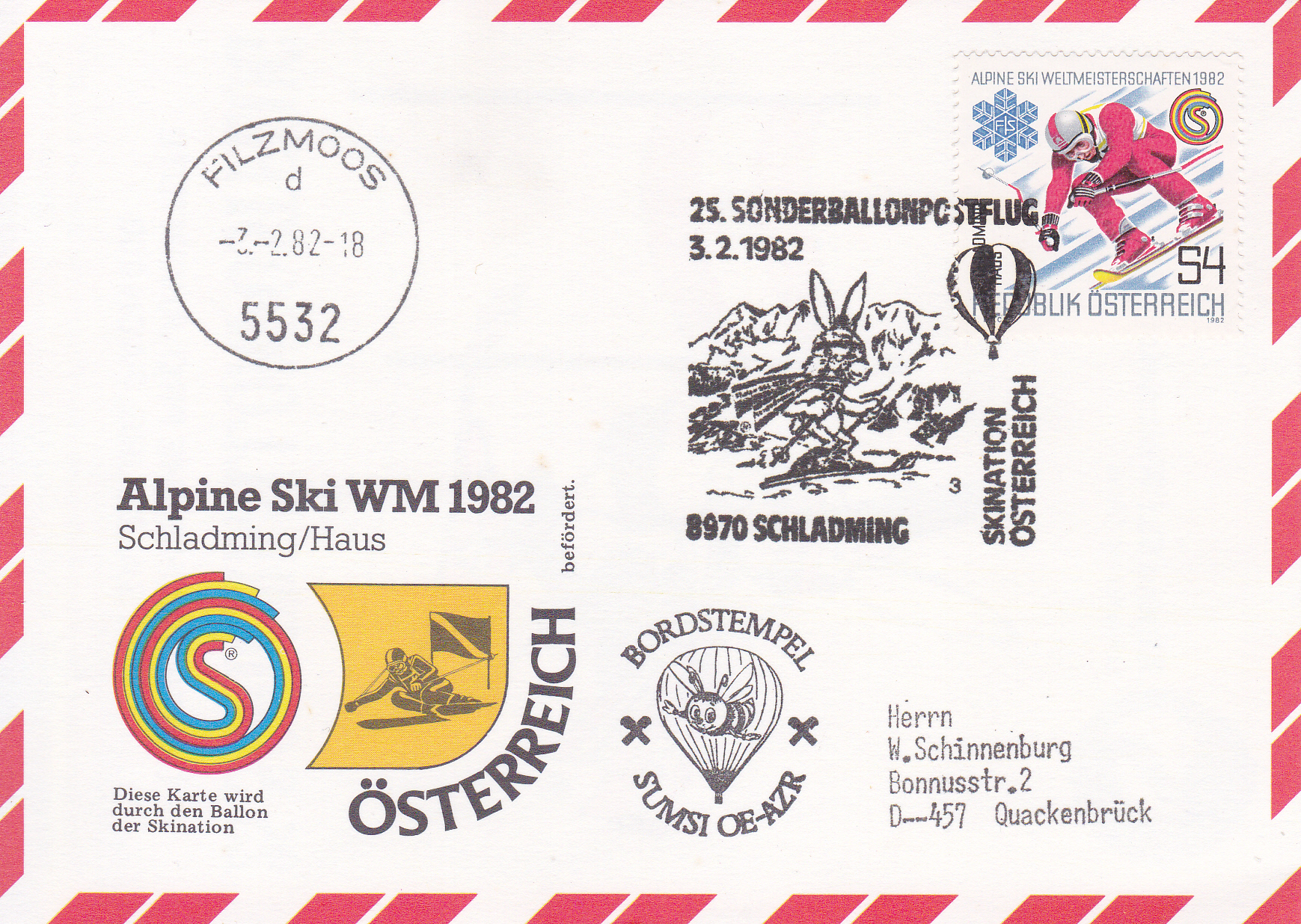 Diese Karte wurde am 3.2.1982 in Schladming für den 25. Sonderballonpostflug der Österreichischen Pro Juventute mit dem Freiballon OE-AZR aufgegeben. Sie erhielt den Sonderstempel mit der Kennziffer "1" aus Schladming zu diesem Ballonflug und wurde am gleichen Tag mit dem Freiballon OE-AZR befördert. Sie erhielt zusätzlich einen Bordstempel und einen Tagesstempel aus Filzmoos mit dem Kennbuchstaben "d".