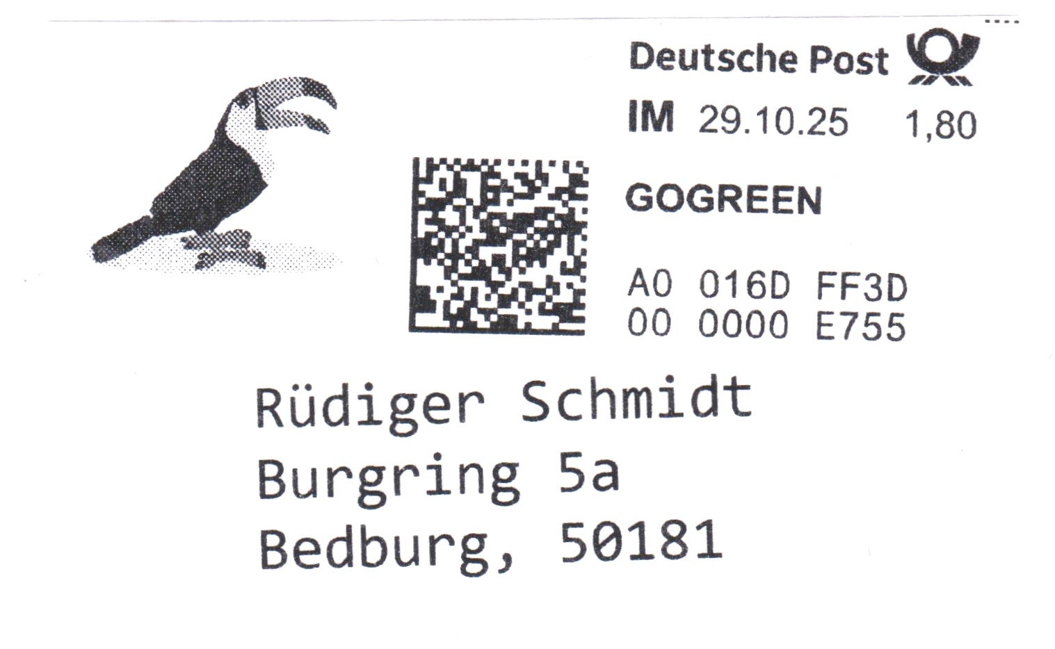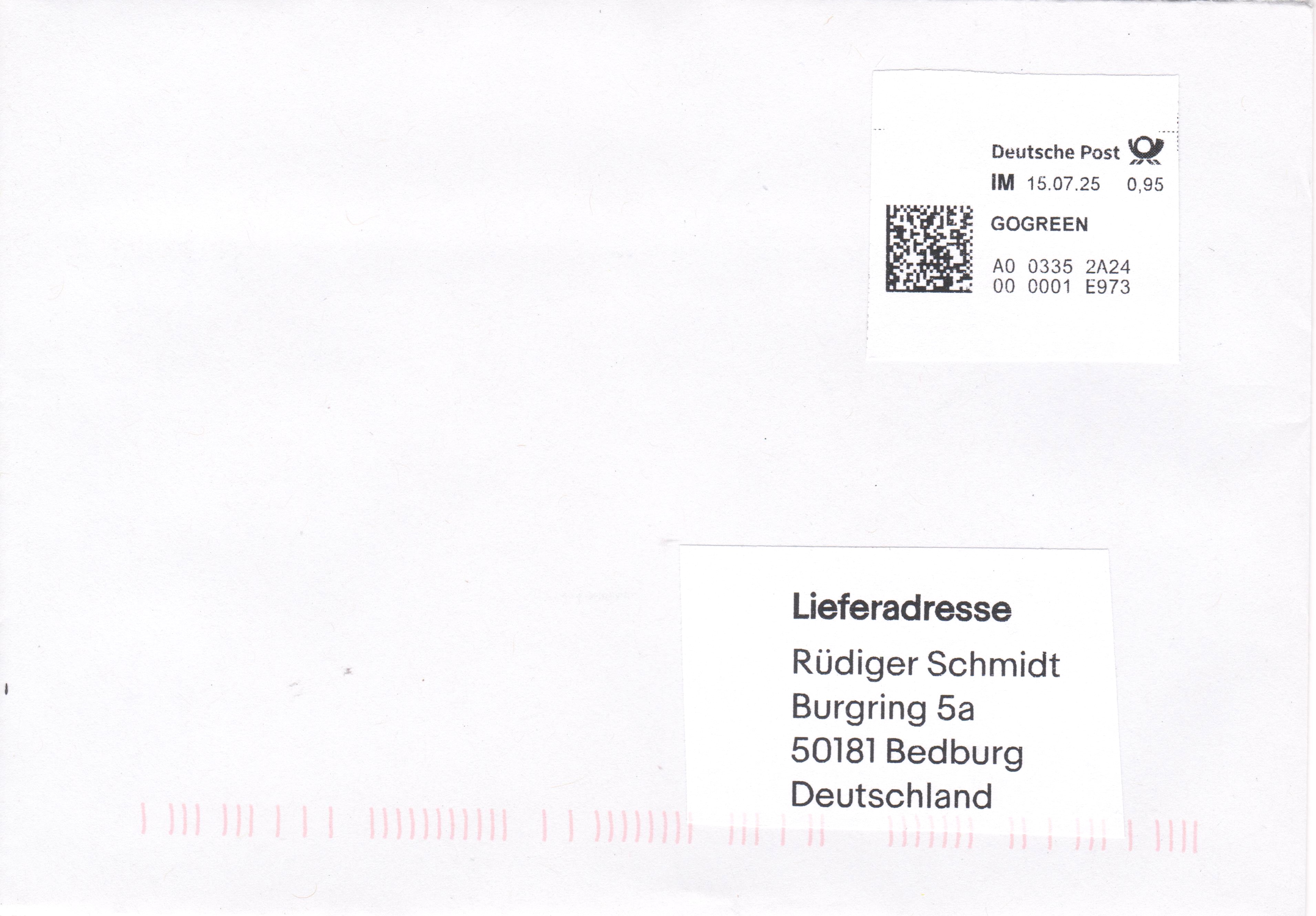 Internetmarke = "IM" am 15.07.2025, Portostufe 0,95 € mit Zusatz GOGREEN: