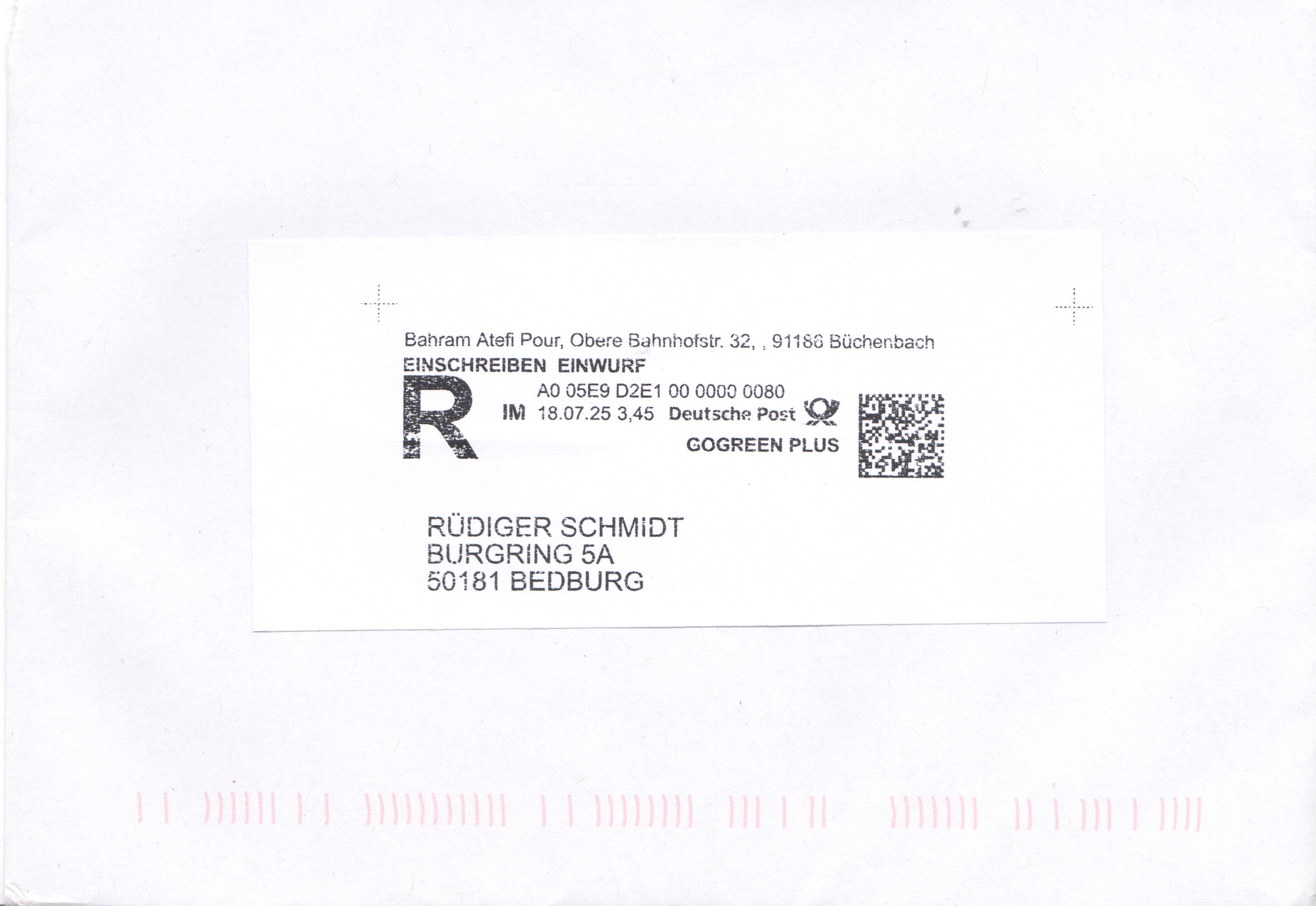 Internetmarke = "IM" am 18.07.2025 für ein EINSCHREIBEN EINWURF, Portostufe 3,45 € mit Zusatz GOGREEN PLUS: