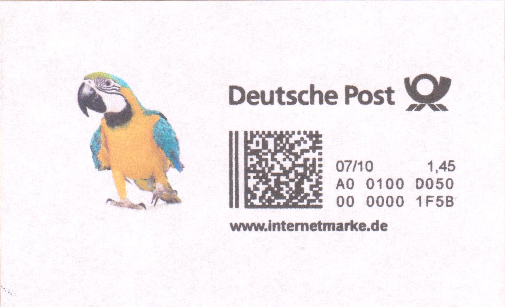 Internetmarke der Portostufe 1,45 € mit Bildeinsatz "Ararauna" (= Gelbbrustara):