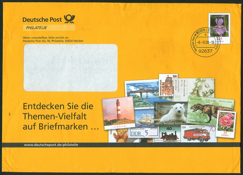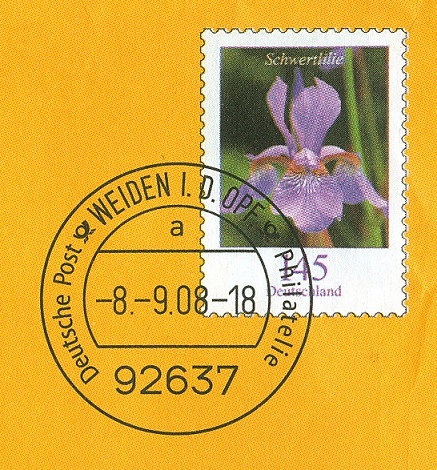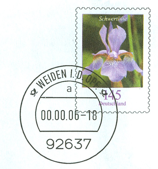 Der Wertstempel (145 Cent) mit dem Motiv der Schwertlilie und dem aufgedruckten V-Datum "