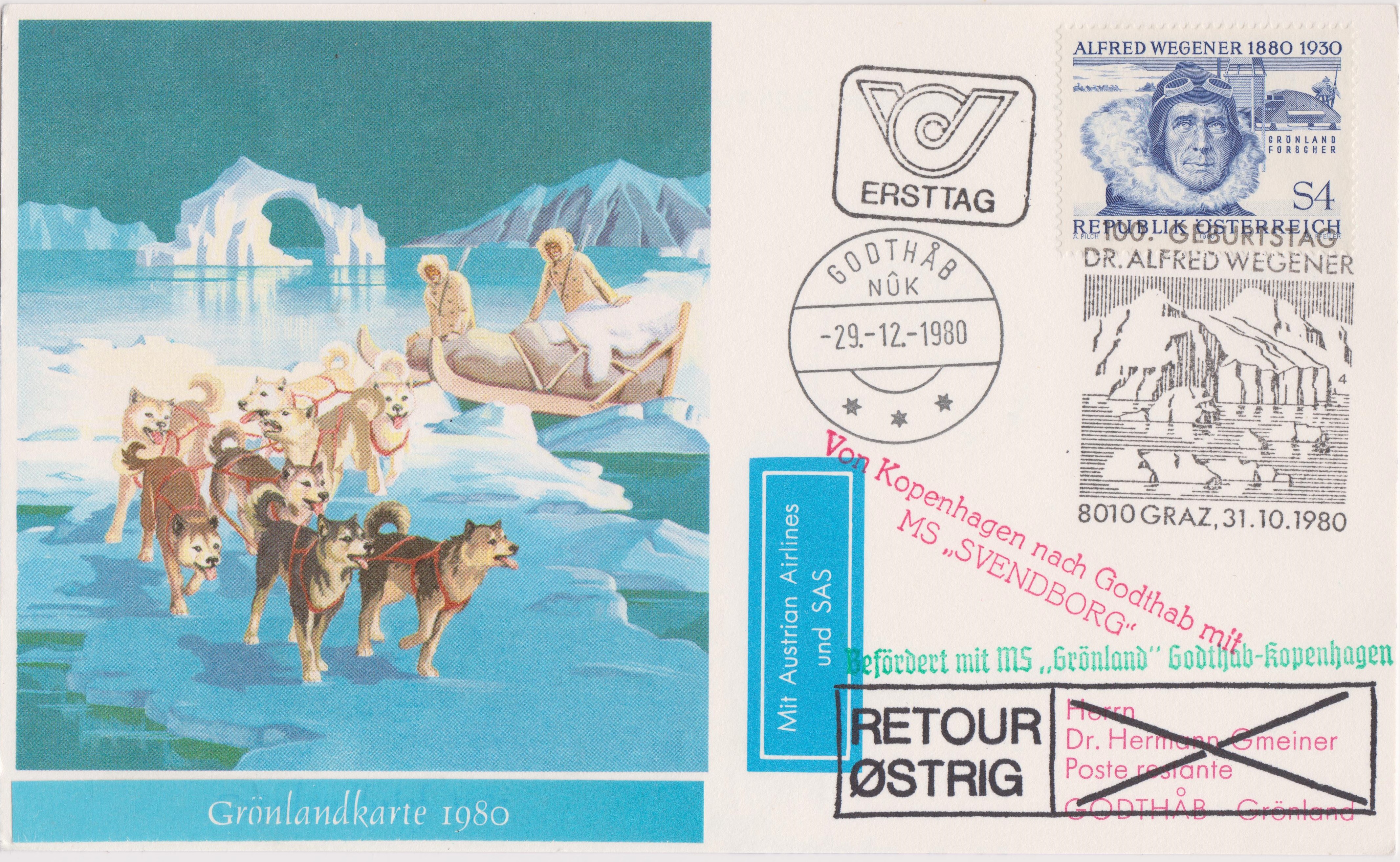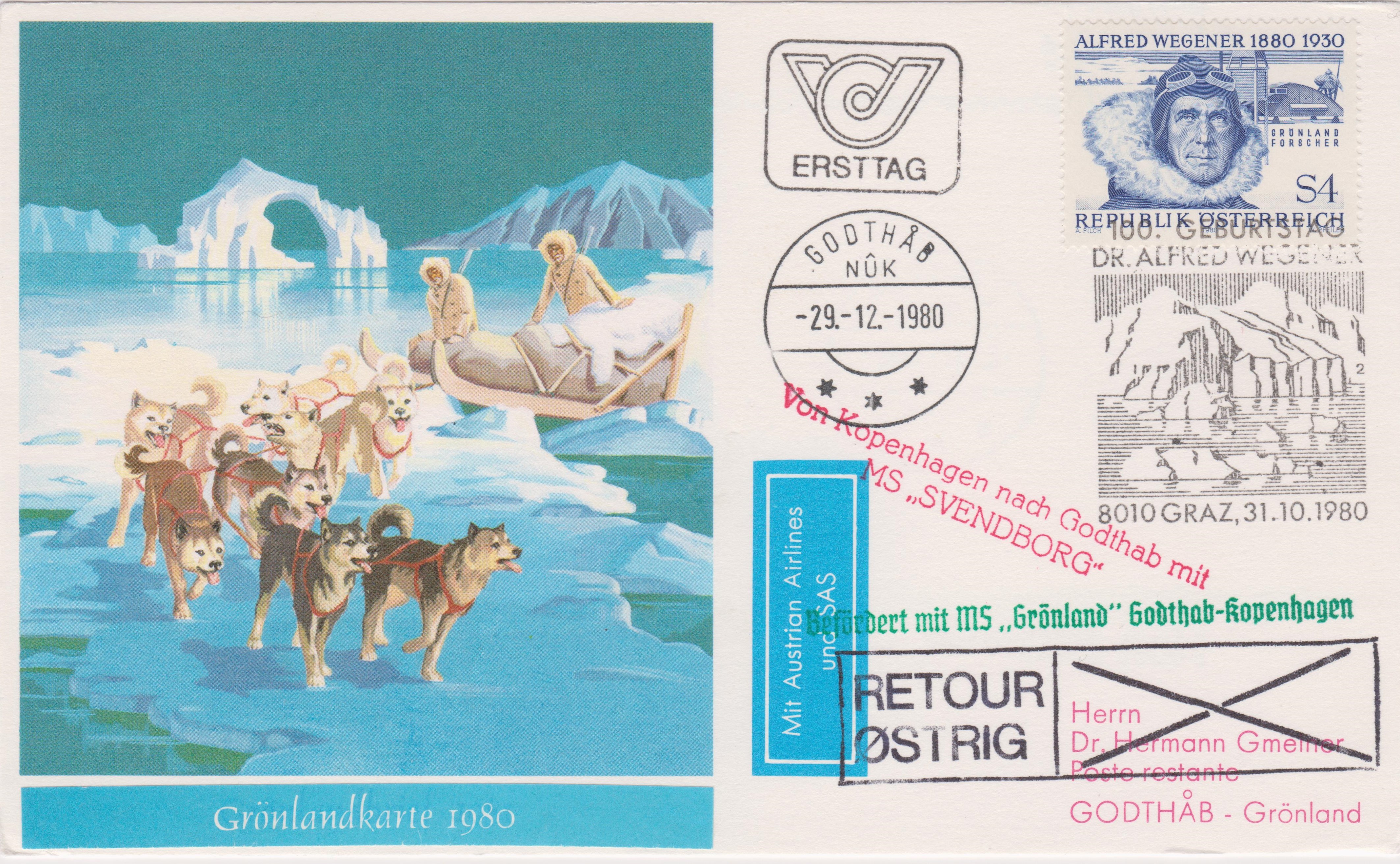 Da als Adresse eine Postlageradresse "Poste restante GODTHAB - Grönland" angegeben war wurde dieser Beleg nach GODTHAB geleitet, zunächst per Flugzeug mit Austrian Airlines und SAS nach Kopenhagen und dann per Schiff mit "MS SVENDEBORG" von Kopenhagen nach Godthab.