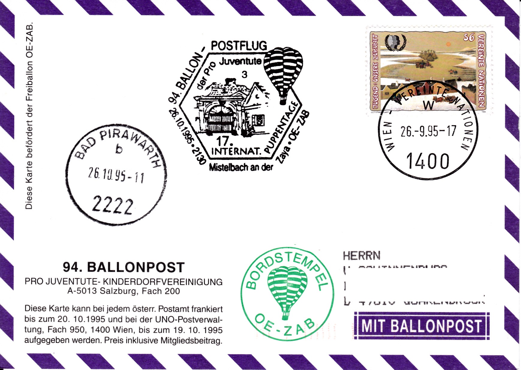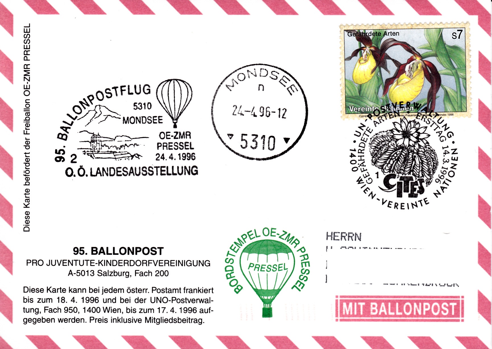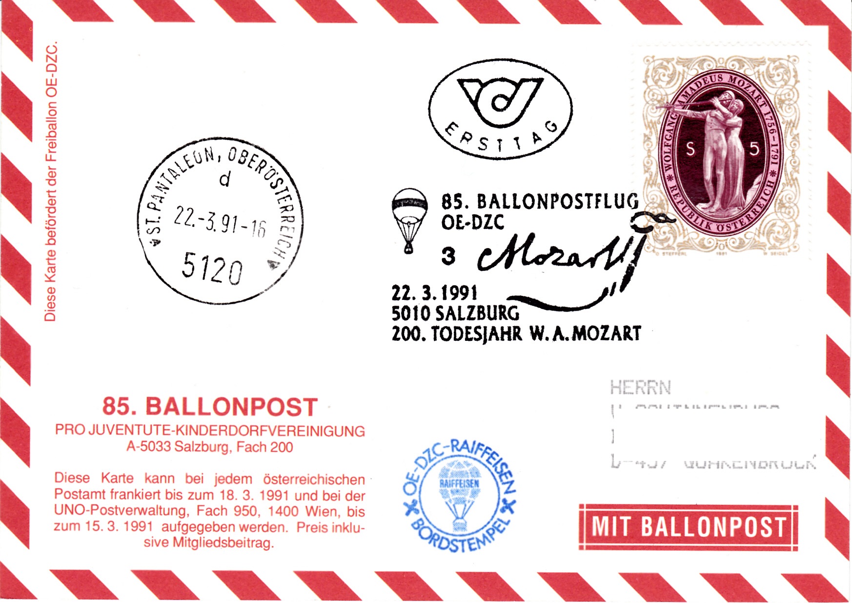 Diese Karte wurde am 22.3.1991 in Salzburg für den 85.Ballonpostflug der Österreichischen Pro Juventute mit dem Freiballon OE-DZC aufgegeben. Er erhielt den Sonderstempel mit der Kennziffer "3" aus Salzburg zu diesem Ballonflug und wurde am gleichen Tag mit dem Freiballon OE-DZC befördert. Der Brief erhielt noch einen Stempel "Ersttag", einen Tagesstempel St. Pantaleon, Oberösterreich und einen Bordstempel.