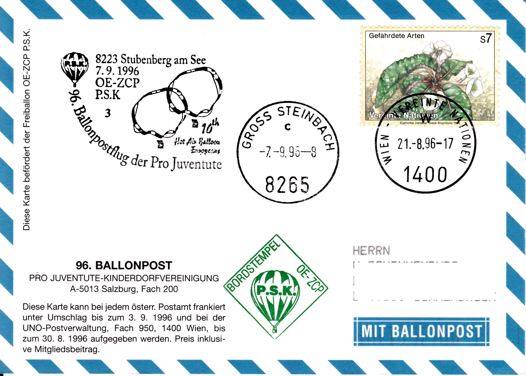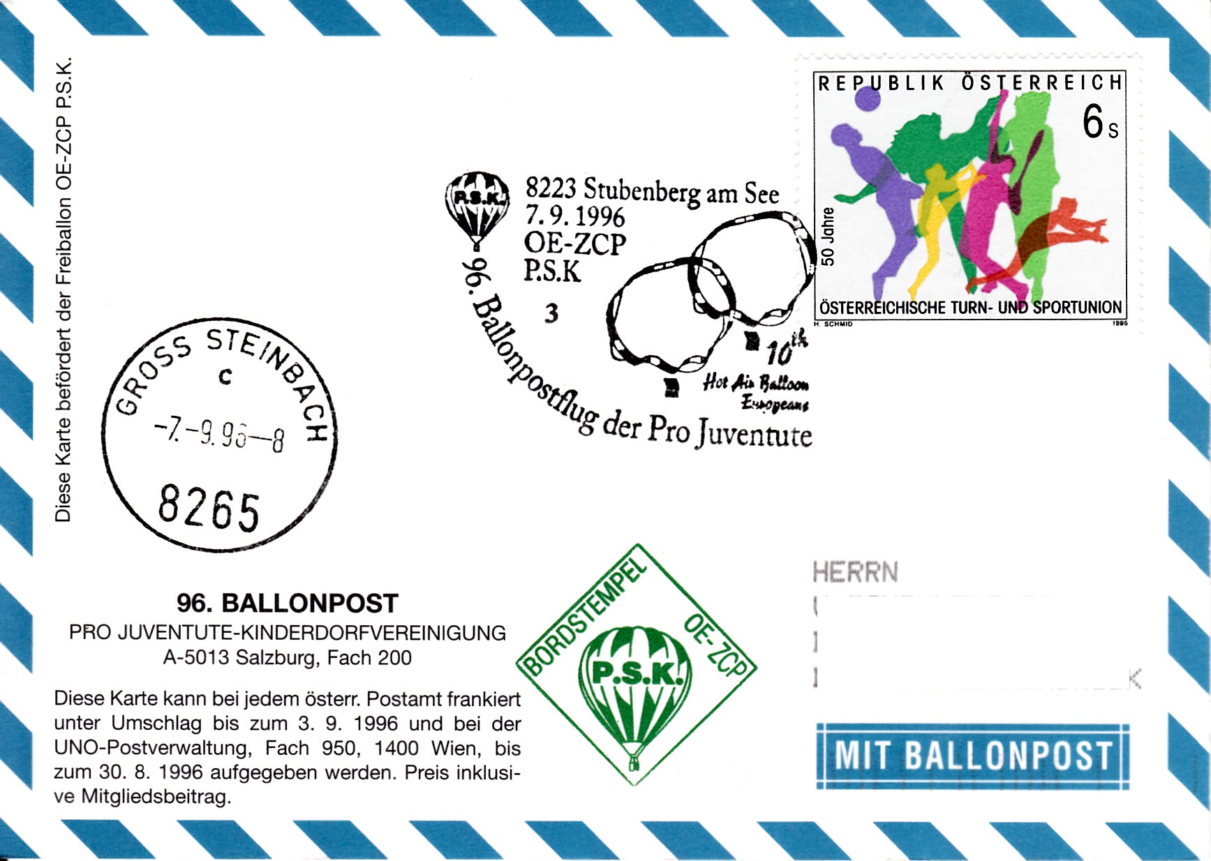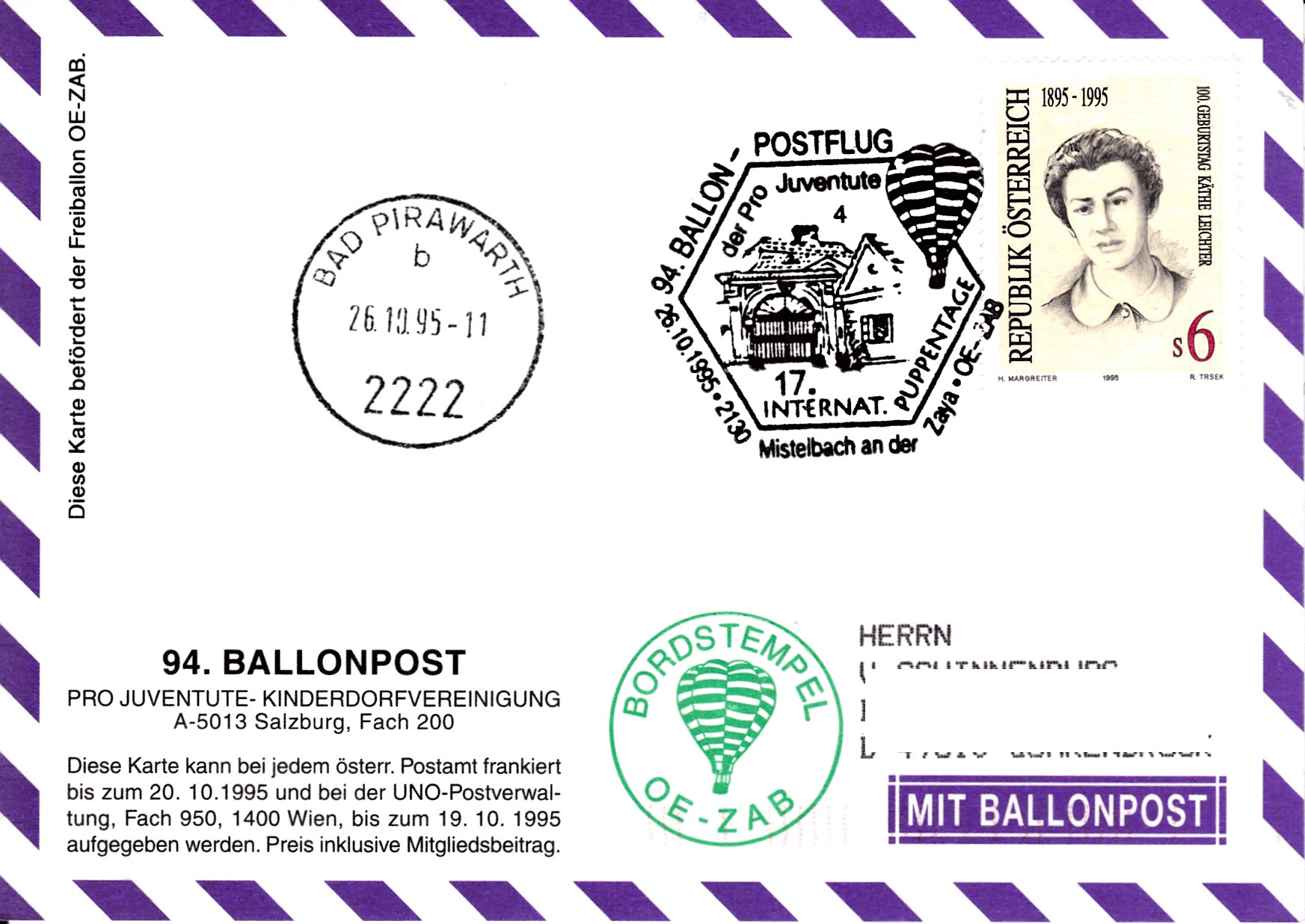 Diese Karte wurde am 22.3.1991 in Salzburg für den 85.Ballonpostflug der Österreichischen Pro Juventute mit dem Freiballon OE-DZC aufgegeben. Er erhielt den Sonderstempel mit der Kennziffer "3" aus Salzburg zu diesem Ballonflug und wurde am gleichen Tag mit dem Freiballon OE-DZC befördert. Der Brief erhielt noch einen Stempel "Ersttag", einen Tagesstempel St. Pantaleon, Oberösterreich und einen Bordstempel.