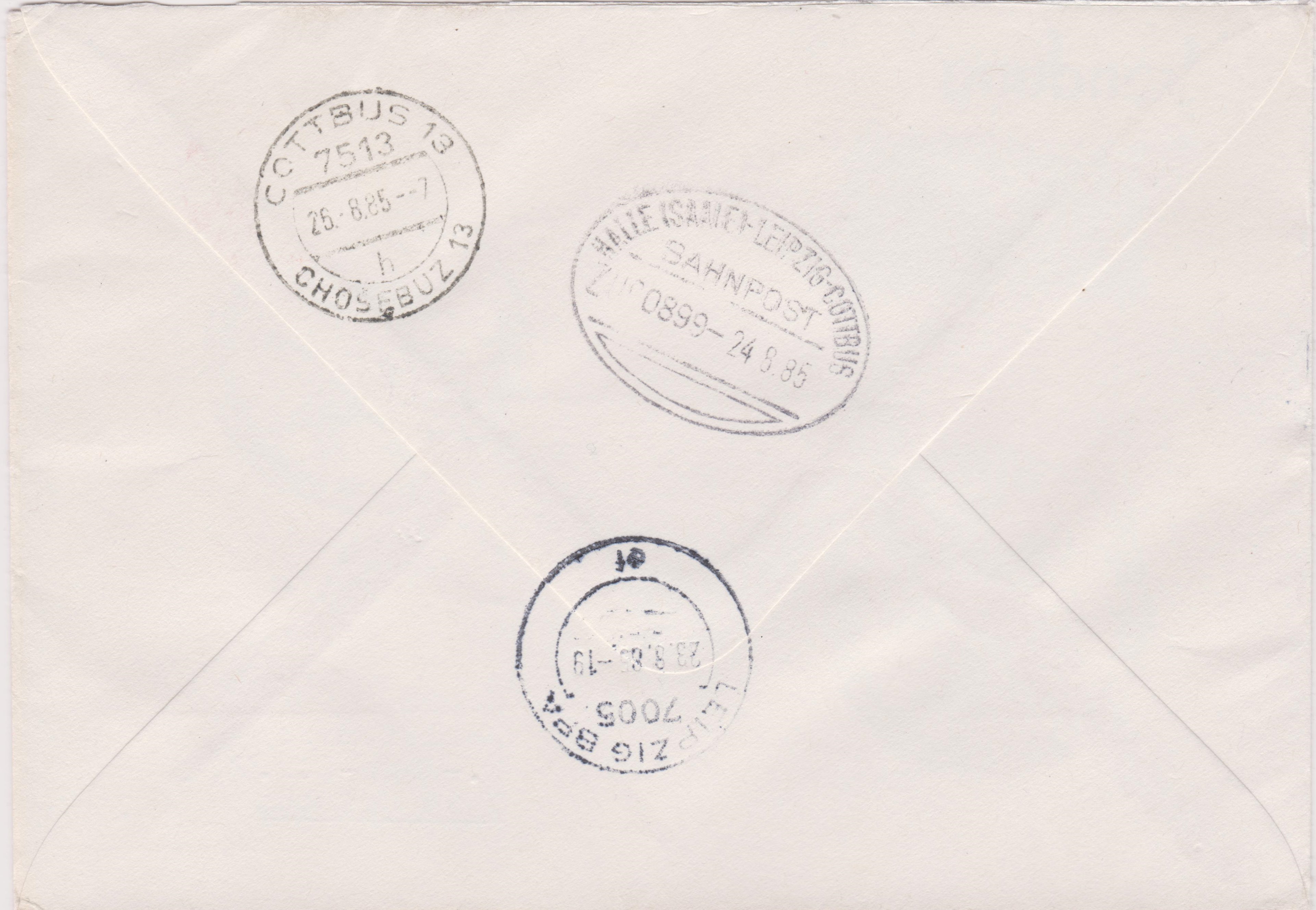 Dann wurde der Brief am 24.08.1985 per BAHNPOST auf der Strecke HALLE (SAALE)-LEIPZIG-COTTBUS mit ZUG0899 nach 7513 COTTBUS 13 befördert, wo er laut zweisprachigem Tagesstempel deutsch/sorbisch am 26.08.1985 morgens um 7 Uhr ankam und somit mit der normalen Tagespost zugestellt werden konnte!
