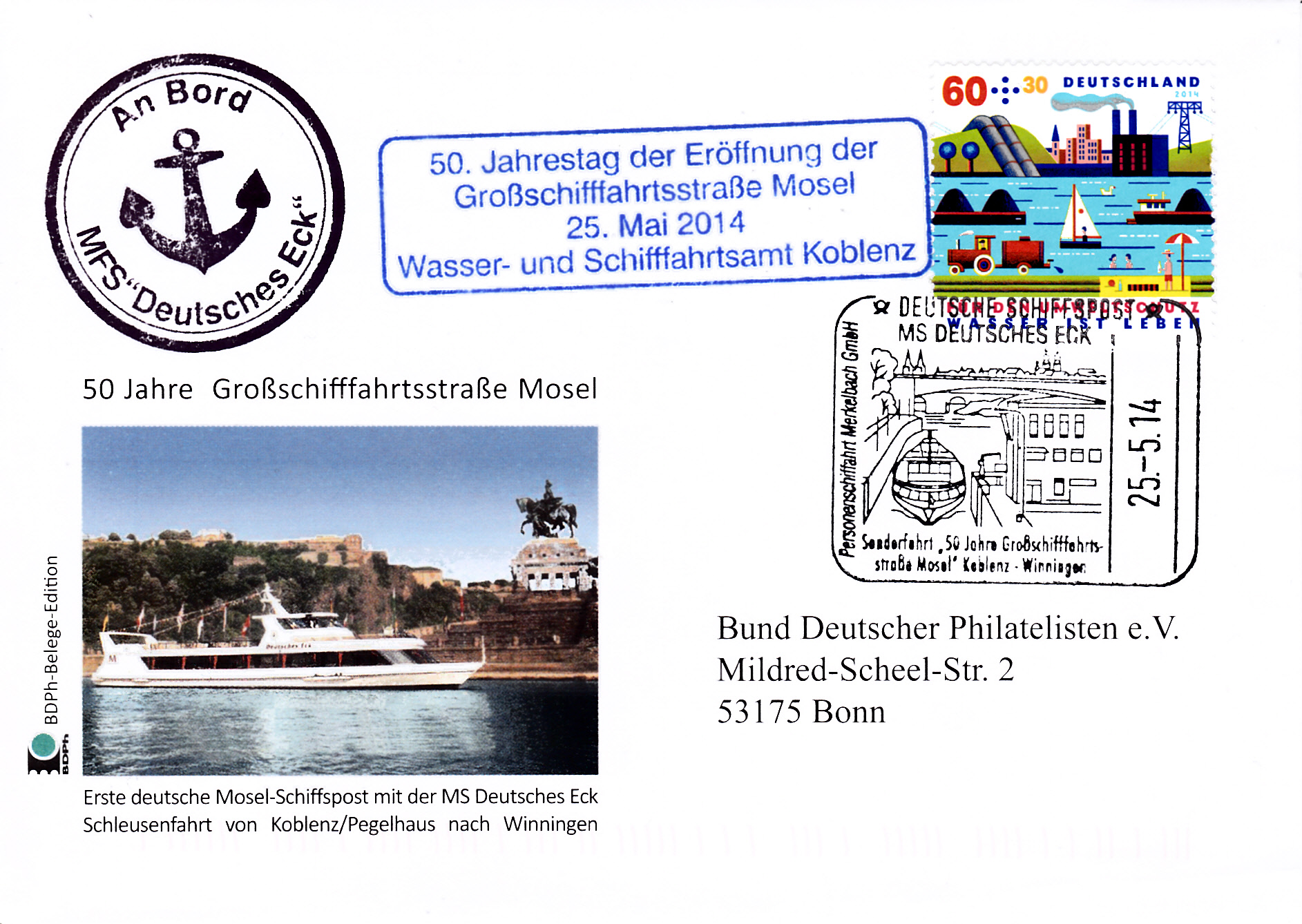 Dieser Brief wurde am 25.5.2014 an Bord der MFS Deutsches Eck von Koblenz nach Winningen befördert und ist mit einem passenden Schiffspoststempel der Deutschen Post gestempelt.