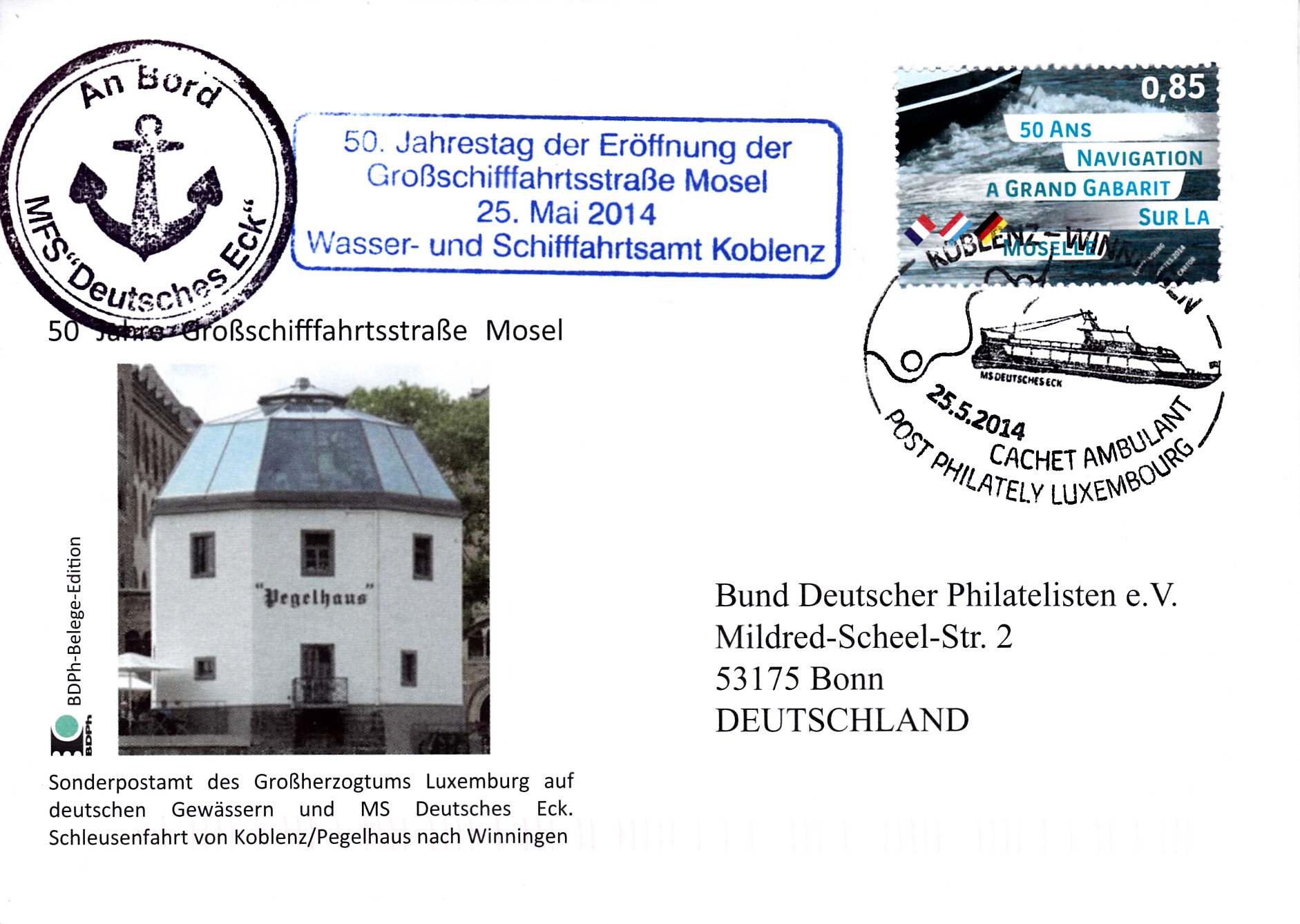 Dieser Brief wurde am 25.5.2014 an Bord der MFS Deutsches Eck von Koblenz nach Winningen befördert und ist mit einem passenden Sonderstempel der Luxemburgischen Post gestempelt.
