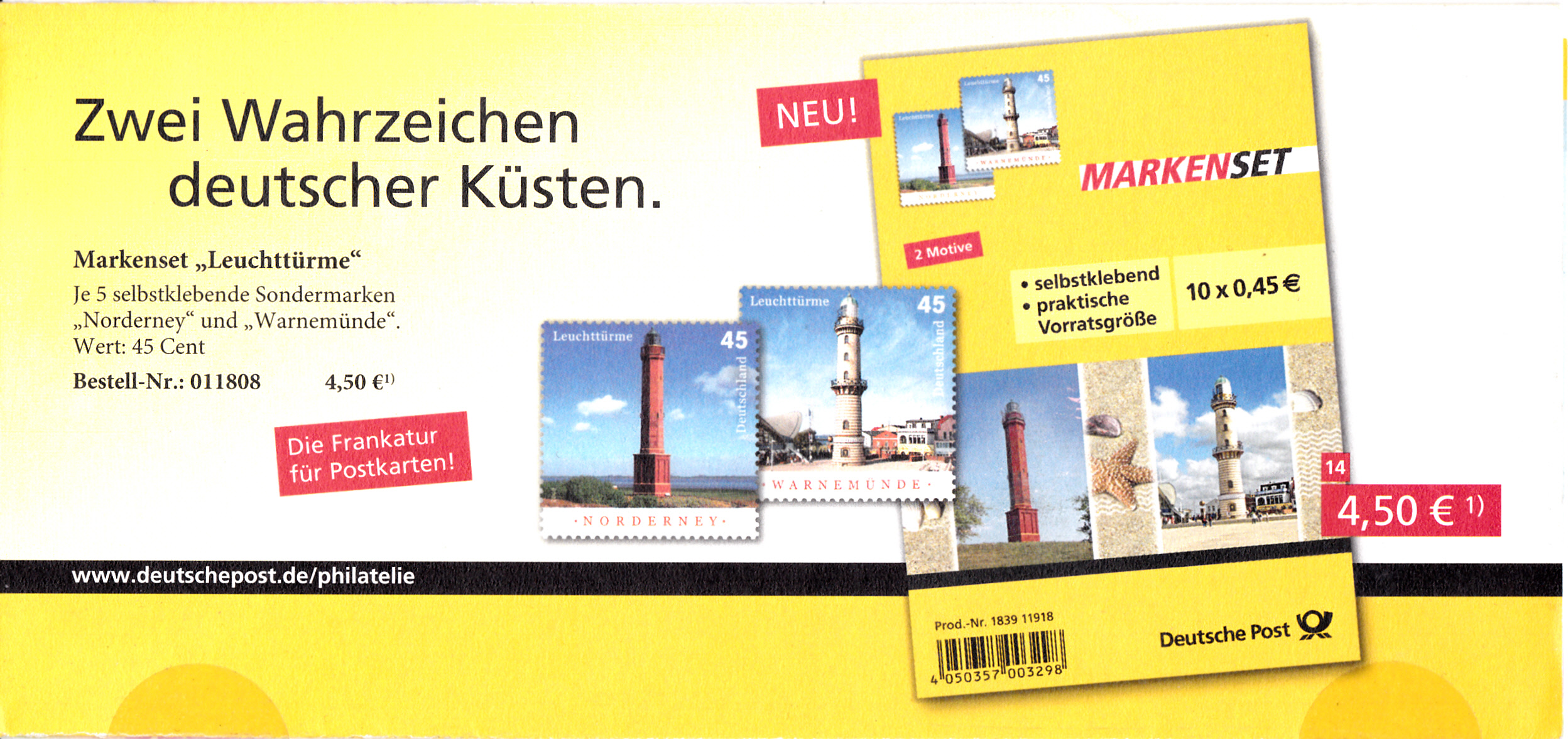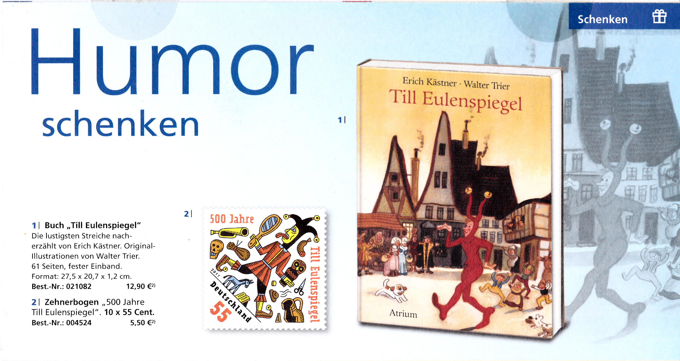 Faltbrief 235 mm x 125 mm (MiuNr EA B96 02) mit den Wertstempel einer Automatenmarke "Post Tower" zu 35 Cent und einem Wertstempel der 55 Cent-Marke "500 Jahre Till Eulenspiegel" (MiNr 2880) mit aufgedruckter Zähnung und Vorausentwertung "Deutsche Post (Posthorn) WEIDEN I.D.OPF (Posthorn) Privatkunden/Philatelie / a / -4.-6.17-12". Die Verwendung des Wertstempel erfolgte bereits vor der Ausgabe der Marke am 7.7.2011.