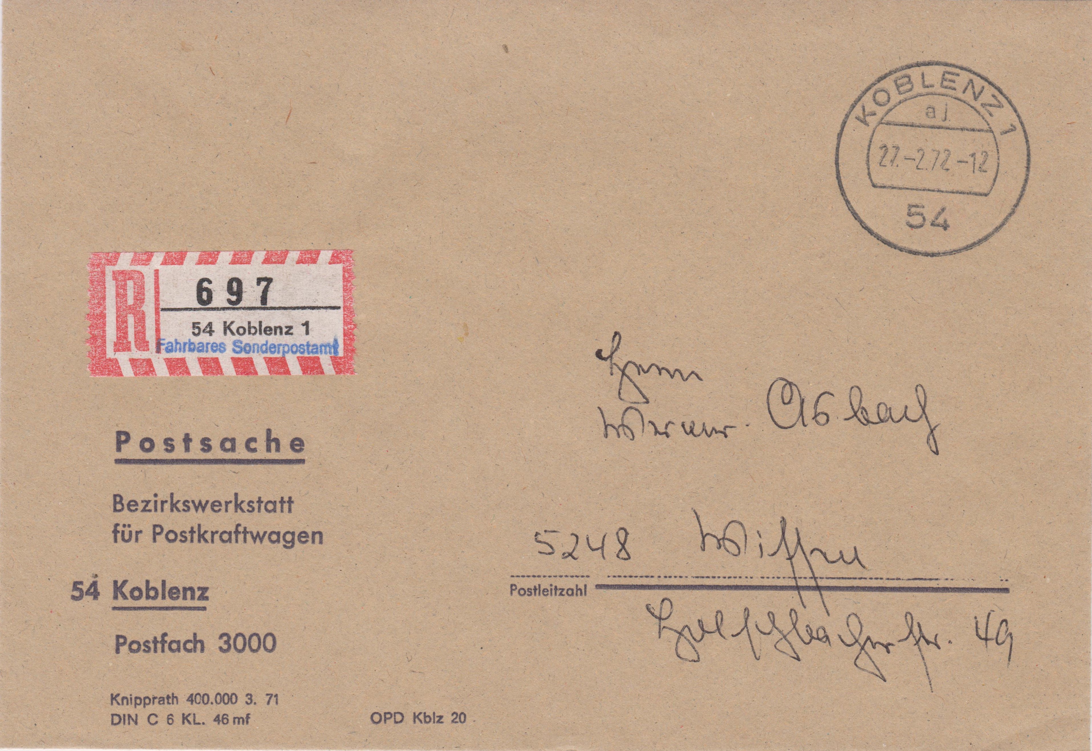 Diese "Postsache" wurde zum Neubau der Werkstatt für Postkraftwagen Koblenz am 25.02.1972 mit Tagesstempel 54 KOBLENZ 1 aj aufgegeben vom Absender "BEZIRKSWERKSTATT FÜR POSTKRAFTWAGEN KOBLENZ a", erhielt den R-Zettel 54 Koblenz 1 mit der Nummer "220" und wurde mit einem Stempel in Blau ergänzt um "Fahrbares Sonderpostamt":