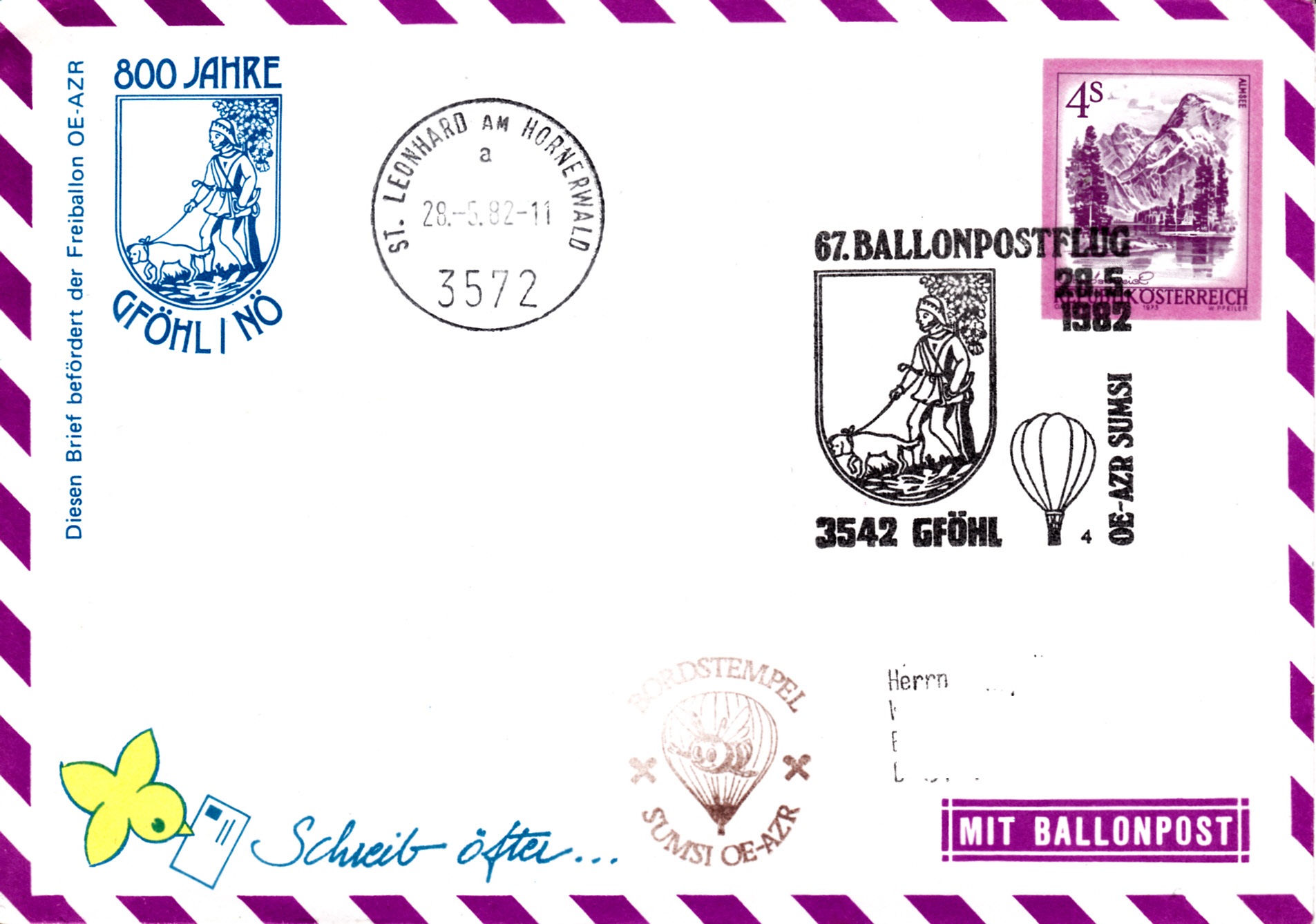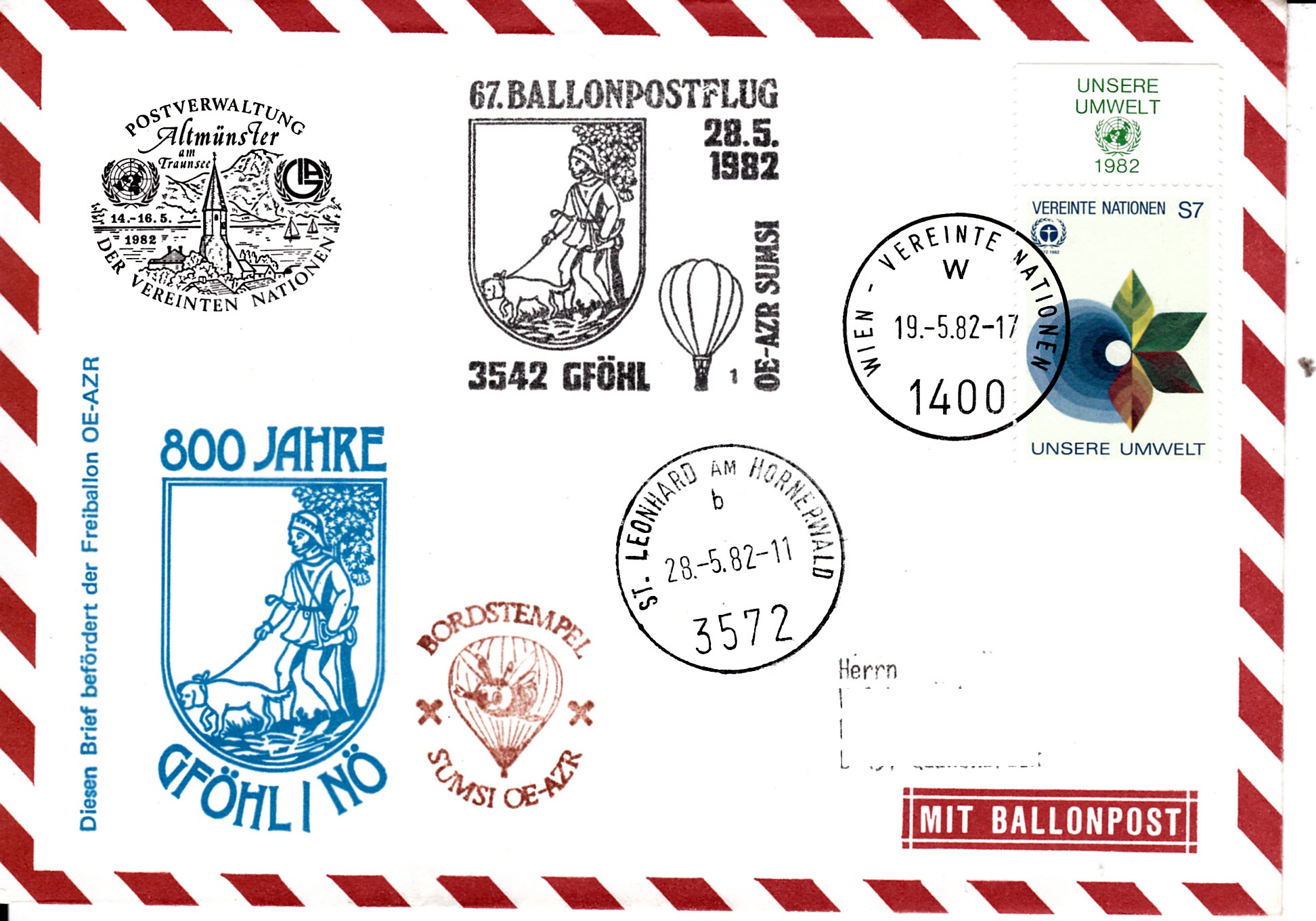 Dieser Brief wurde am 19.5.1982 für den 67. Ballonpostflug der Österreichischen Pro Juventute mit dem Freiballon OE-AZR SUMSI in Wien beim UNO-Postamt aufgegeben. Die zur Frankatur verwendete Marke der UNO-Postverwaltung Wien wurde mit einem Tagesstempel Wien - Vereinte Nationen gestempelt. Am 28.5.1982 erhielt der Brief den Sonderstempel aus Gföhl mit der Kennziffer "1" zu diesem 67. Ballonpostflug. Zusätzlich wurden ein Tagesstempel aus St. Leonhard am Hornerwald mit dem Kennbuchstaben "b" und ein Bordstempel auf dem Brief angebracht.
