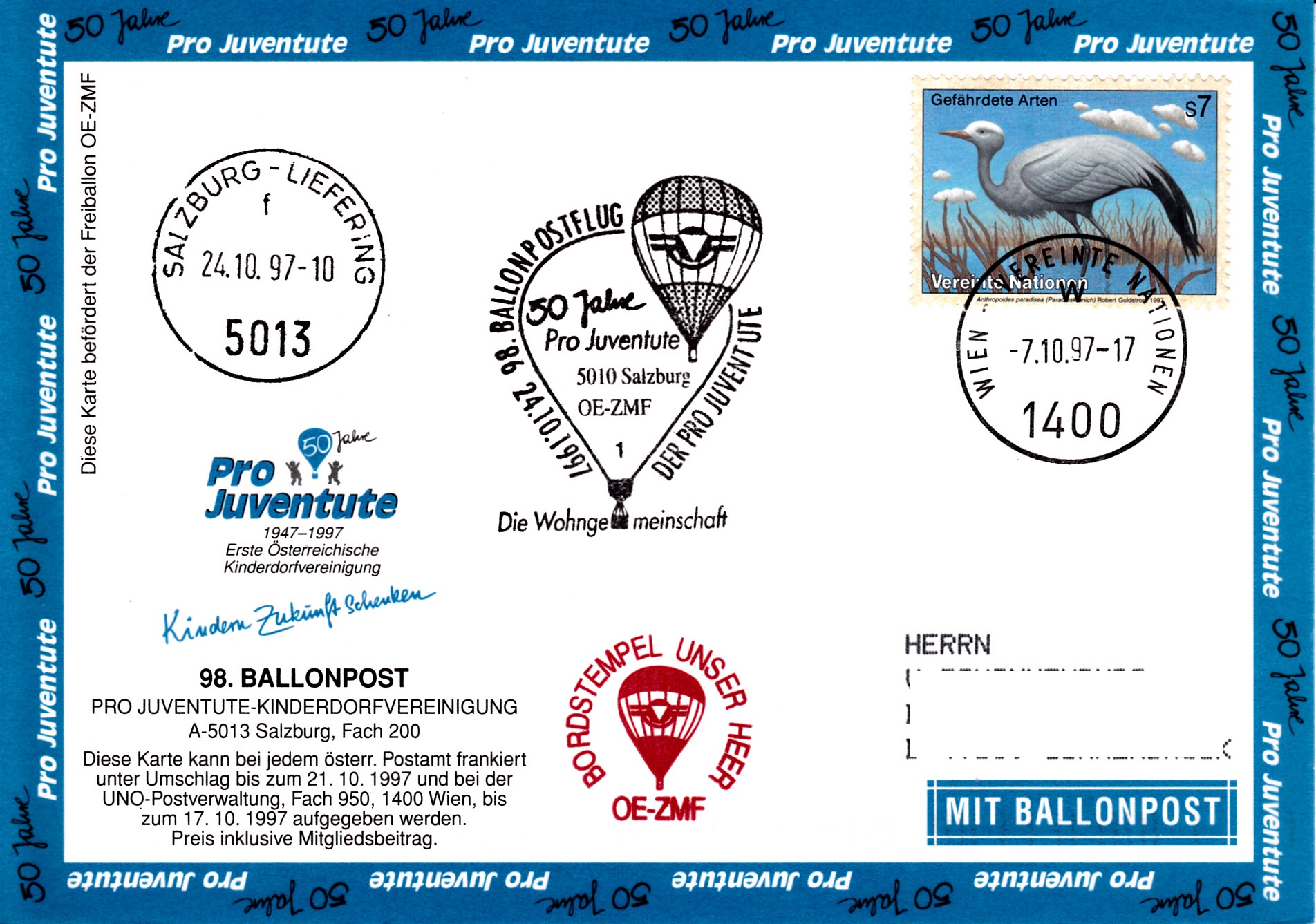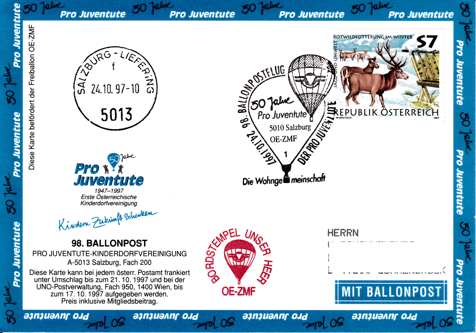 Diese Karte wurde am 24.10.1997 in Salzburg für den 98. Ballonpostflug der Österreichischen Pro Juventute mit dem Freiballon OE-ZMF aufgegeben. Sie erhielt den Sonderstempel mit der Kennziffer "1" aus Salzburg zu diesem Ballonflug und wurde am gleichen Tag mit dem Freiballon OE-ZMF befördert. Sie erhielt zusätzlich einen Tagesstempel Salzburg-Liefering und einen Bordstempel.