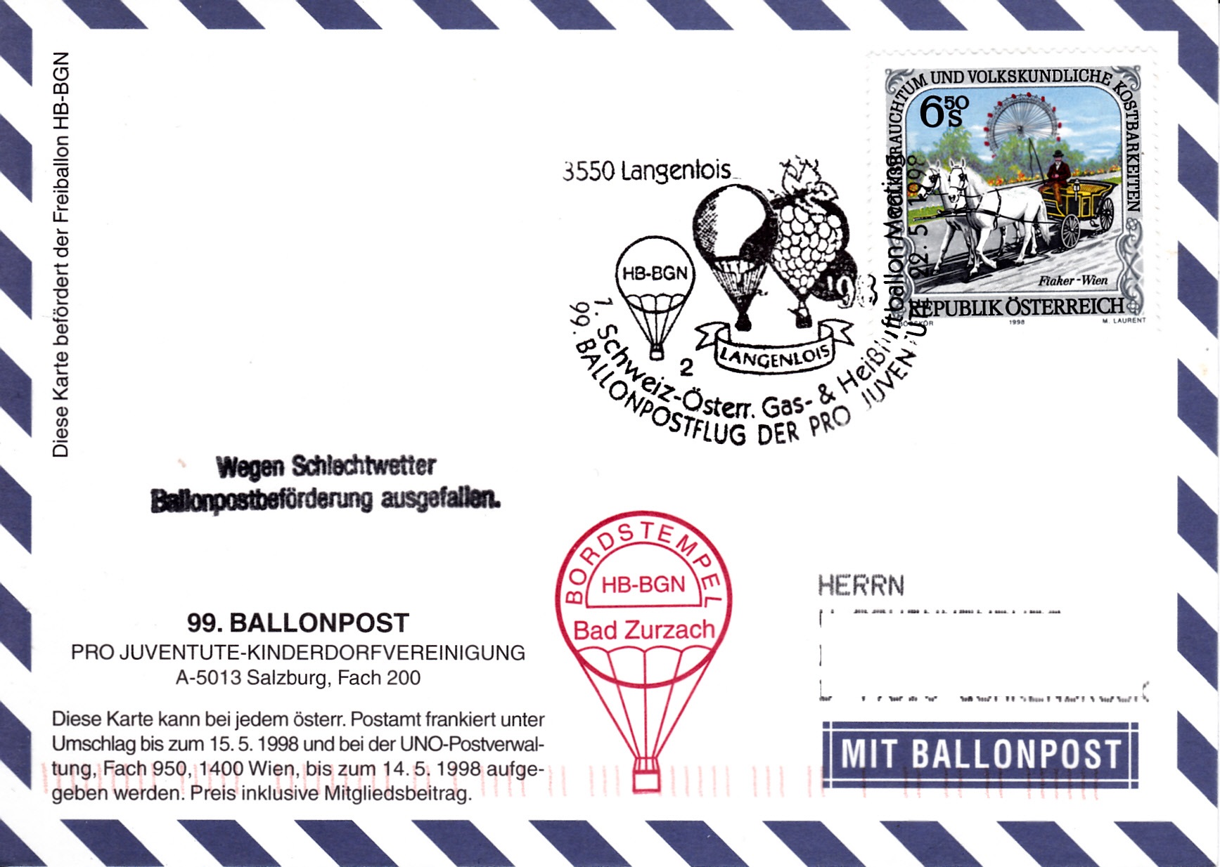 Diese Karte wurde am 22.5.1998 in Langenlois für den 99. Ballonpostflug der Österreichischen Pro Juventute mit dem Freiballon HB-BGN aufgegeben. Sie erhielt den Sonderstempel mit der Kennziffer "2" aus Langenlois zu diesem Ballonflug. Wegen Schlechtwetter konnte der Ballon jedoch nicht starten. Sie erhielt daher zusätzlich einen Bordstempel und einen Ausfallstempel.