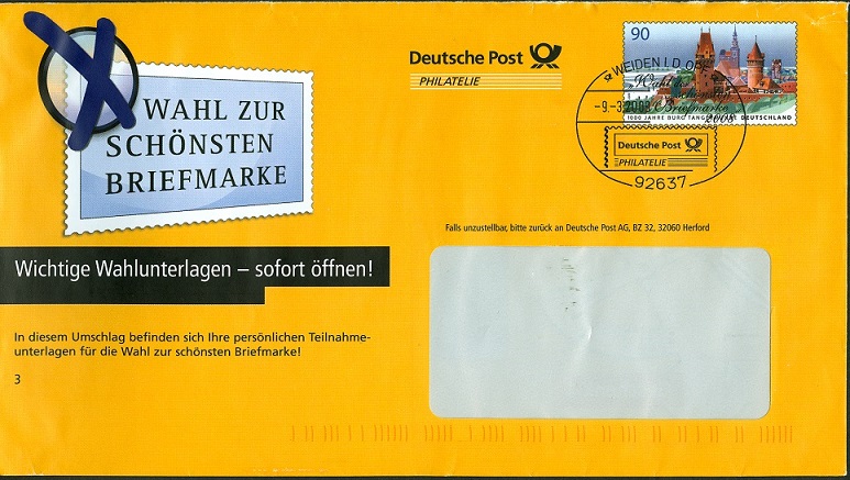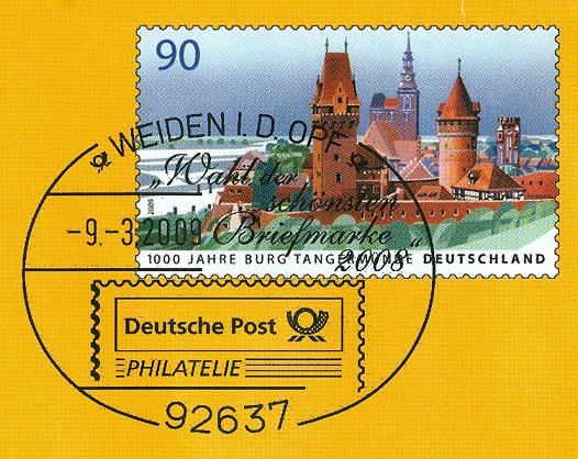 Der Ganzsachenumschlag der EA F 416 zeigt uns als Wertstempel das Motiv der MiNr. 2712 (1000 Jahre Burg Tangermünde). Das Vorausentwertungsdatum "-9.-3.2009" weicht von der sonst üblichen Datumsforn der Eigenausgaben der Serie F ab. Stempelform und -inhalt sind aus der Auflistung nicht ableitbar. Nur der Hinweis auf die ähnliche EA F 398 ist dann zielführend.