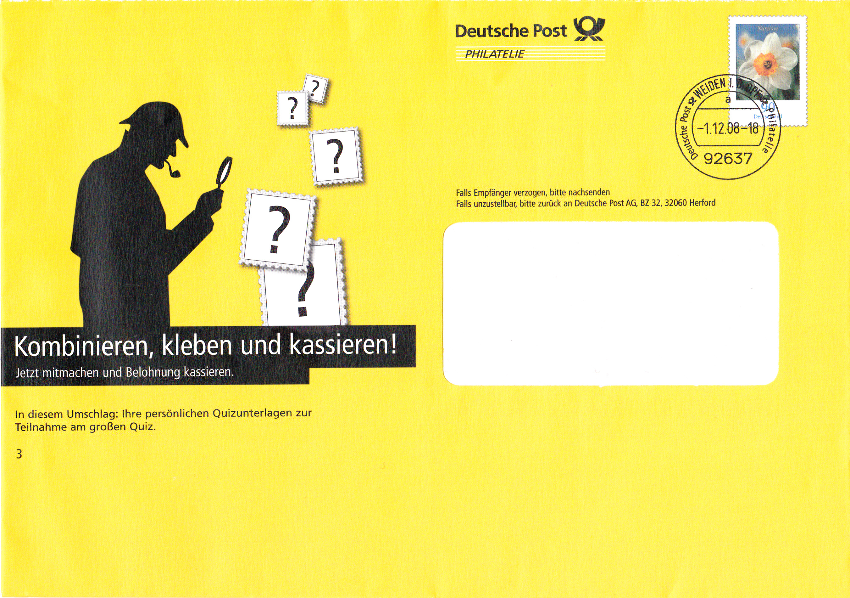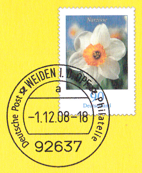 Dieser Ganzsachenumschlag (MiNr EA F385) im Format 229x162 mm hat einen Wertstempel mit der 90 Cent-Marke der Dauerserie "Blumen" mit dem Motiv Narzisse. Die Vorausentwertung trägt das Datum "-1.12.08".