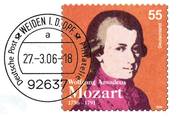 Dieser Ganzsachenumschlag (MiNr EA F129) im Format 229x114 mm hat einen Wertstempel mit der 55 Cent-Marke 250.Geburtstag von W.A. Mozart (MiNr 2512). Die Vorausentwertung trägt das Datum "27.-3.06".