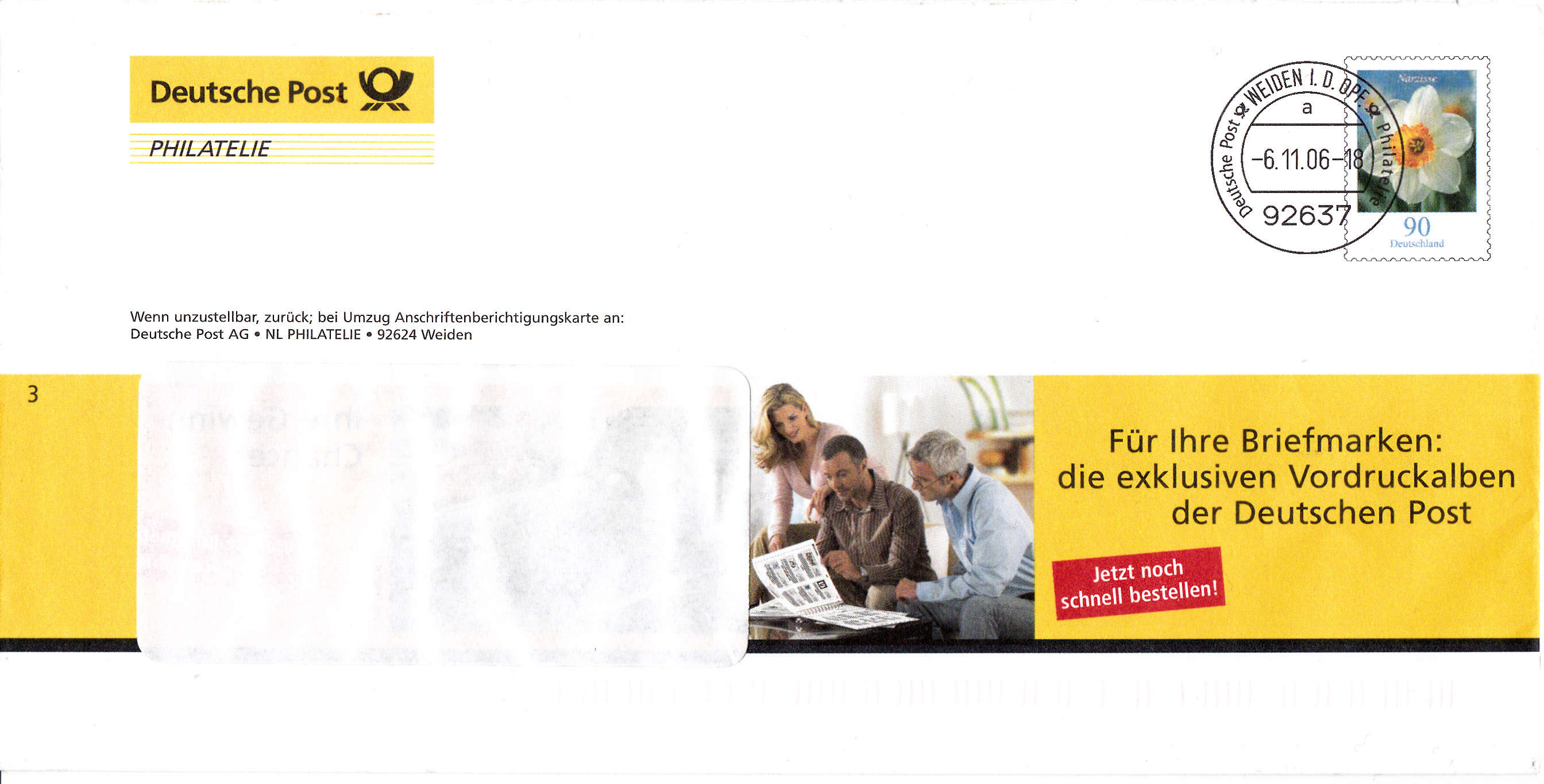 Der Ganzsachenumschlag (MiNr EA F170) im Format 229x114 mm hat einen Wertstempel mit der 90 Cent-Marke der Dauerserie "Blumen" (Narzisse, MiNr 2506). Die Vorausentwertung trägt das Datum "-6.11.06".