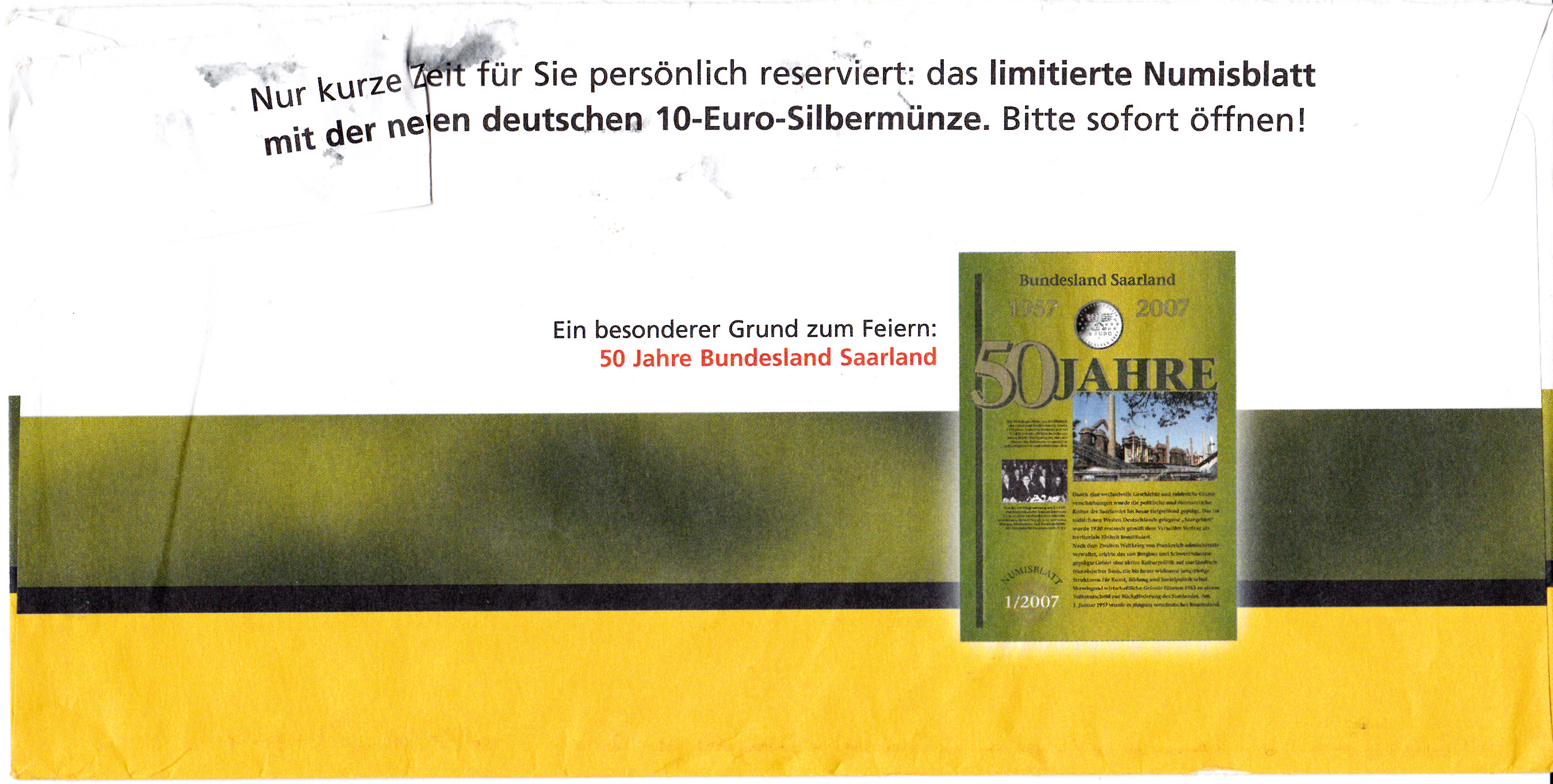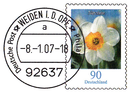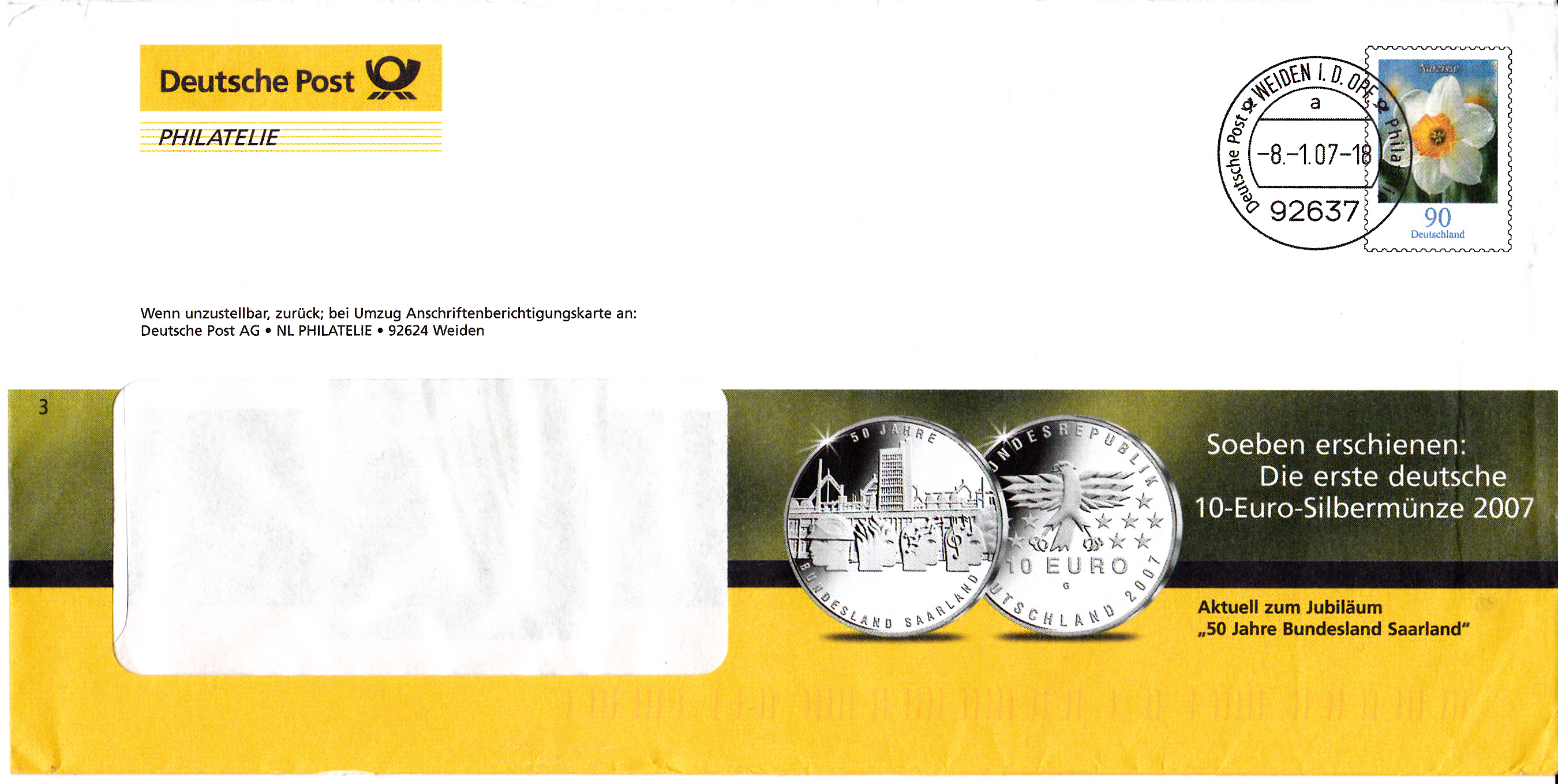Dieser Ganzsachenumschlag (MiNr EA F186) im Format 229x114 mm hat einen Wertstempel mit der 90 Cent-Marke der Dauerserie "Blumen" (Narzisse, MiNr 2506). Die Vorausentwertung trägt das Datum "-8.-1.07".