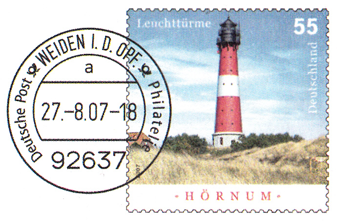 Dieser Ganzsachenumschlag (MiNr EA F239) im Format 229x114 mm hat einen Wertstempel mit der 55 Cent-Marke der Serie "Leuchttürme" (Hörnum, Insel Sylt, MiNr 2613). Die Vorausentwertung trägt das Datum "27.-8.07". Die Rückseite ist nicht bedruckt.