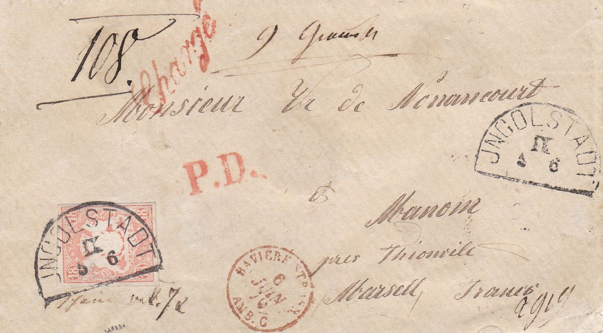 heute stelle ich einen Brief vor, der eine Besonderheit zeigt: Nach dem Postvertrag Bayerns mit Frankreich vom 1.7.1858 war das Franko auf 12 Kreuzer je 10g festgesetzt worden. Im Falle der Einschreibung (Recommadation, Chargé) sollte der Absender frankieren und dabei 6 Kreuzer für die französische Einschreibung in Marken und 6 Kreuzer für die bayerische Einschreibung bar entrichten. Ab 1.1.1868 erhöhte sich - nur für Bayern - die Höhe der Chargégebühr auf 7 Kreuzer, daher haben wir ab dieser Zeit 25 Kreuzer Frankaturen.