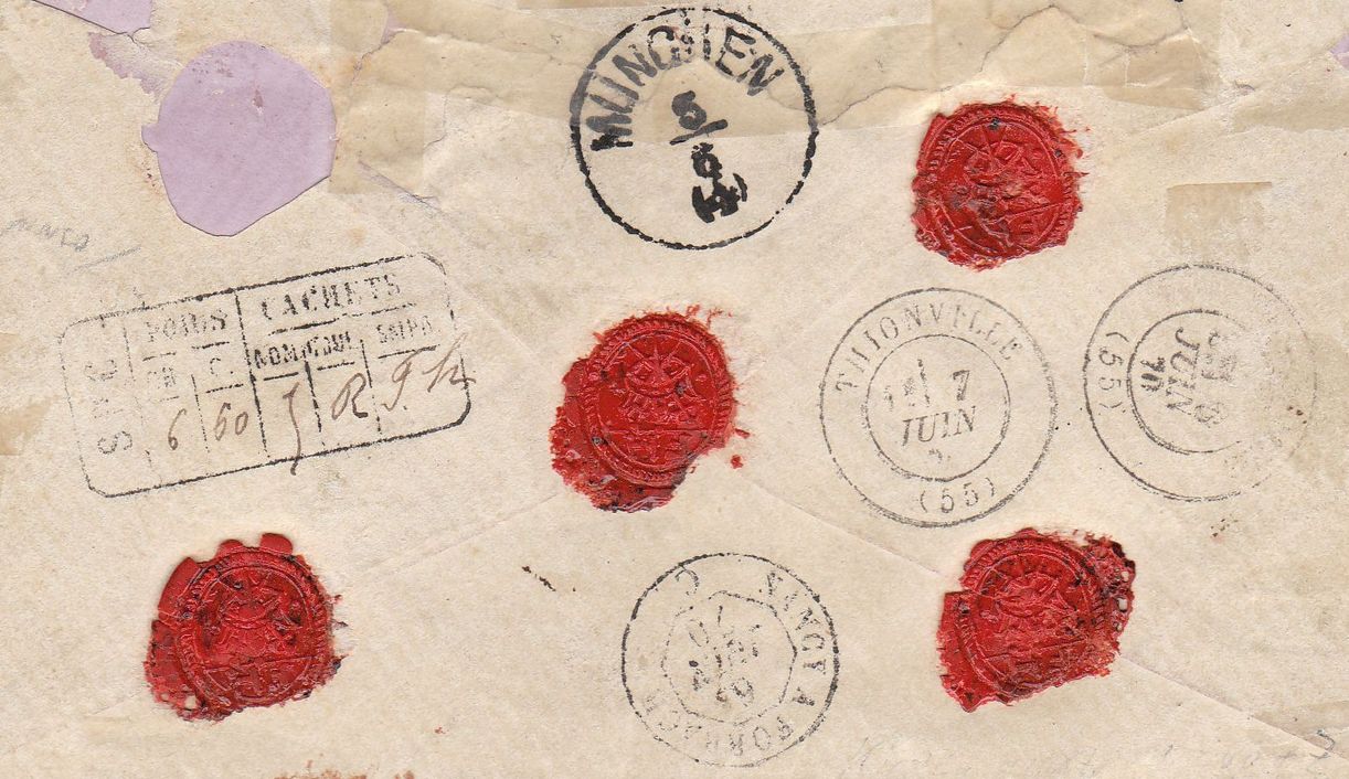 Siegelseitig sehen wir den französischen Multifunktionsrecommandationsstempel und die Transitstempel, die die Reise mit der Bahnpost nachvollziehbar werden lassen.