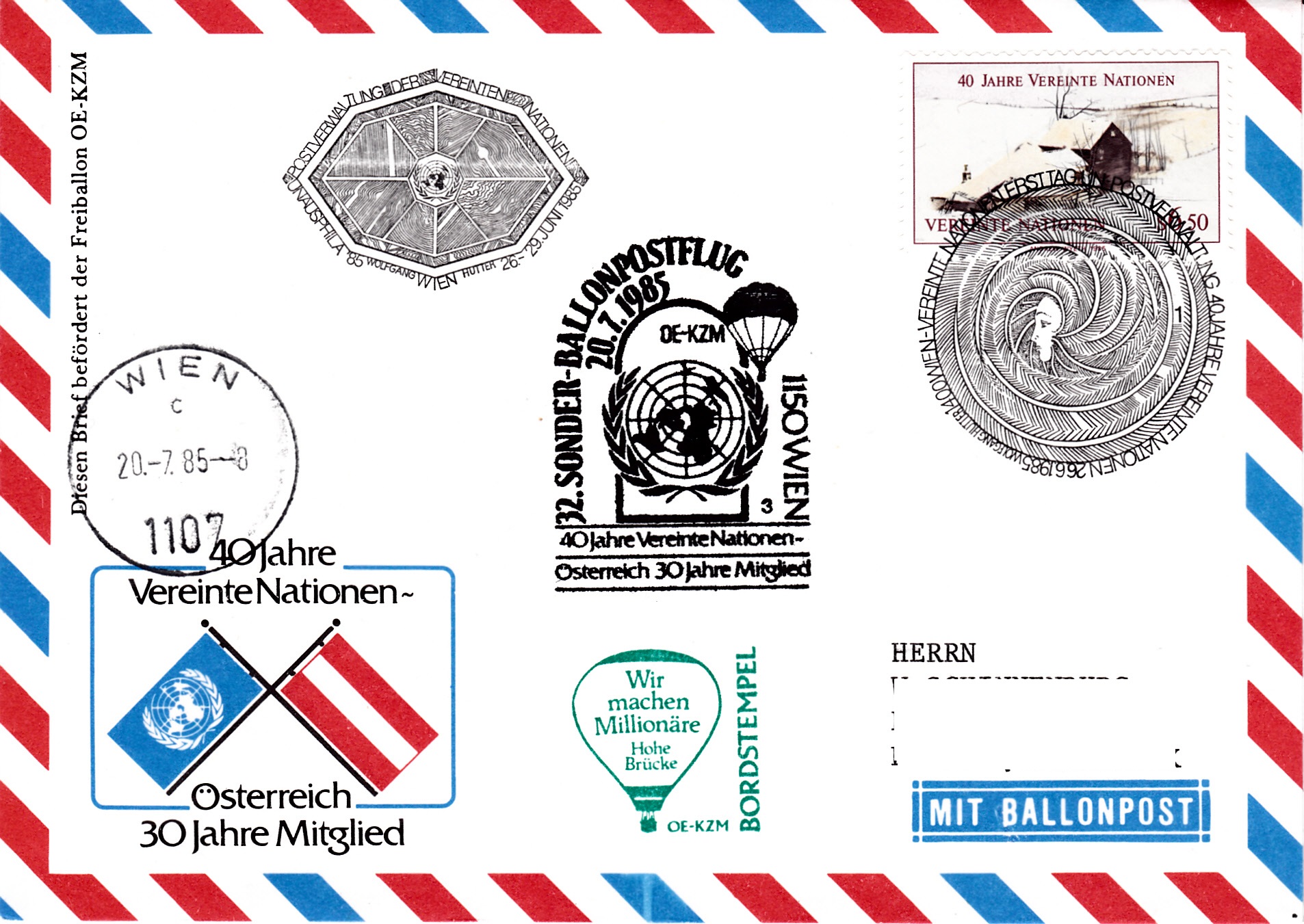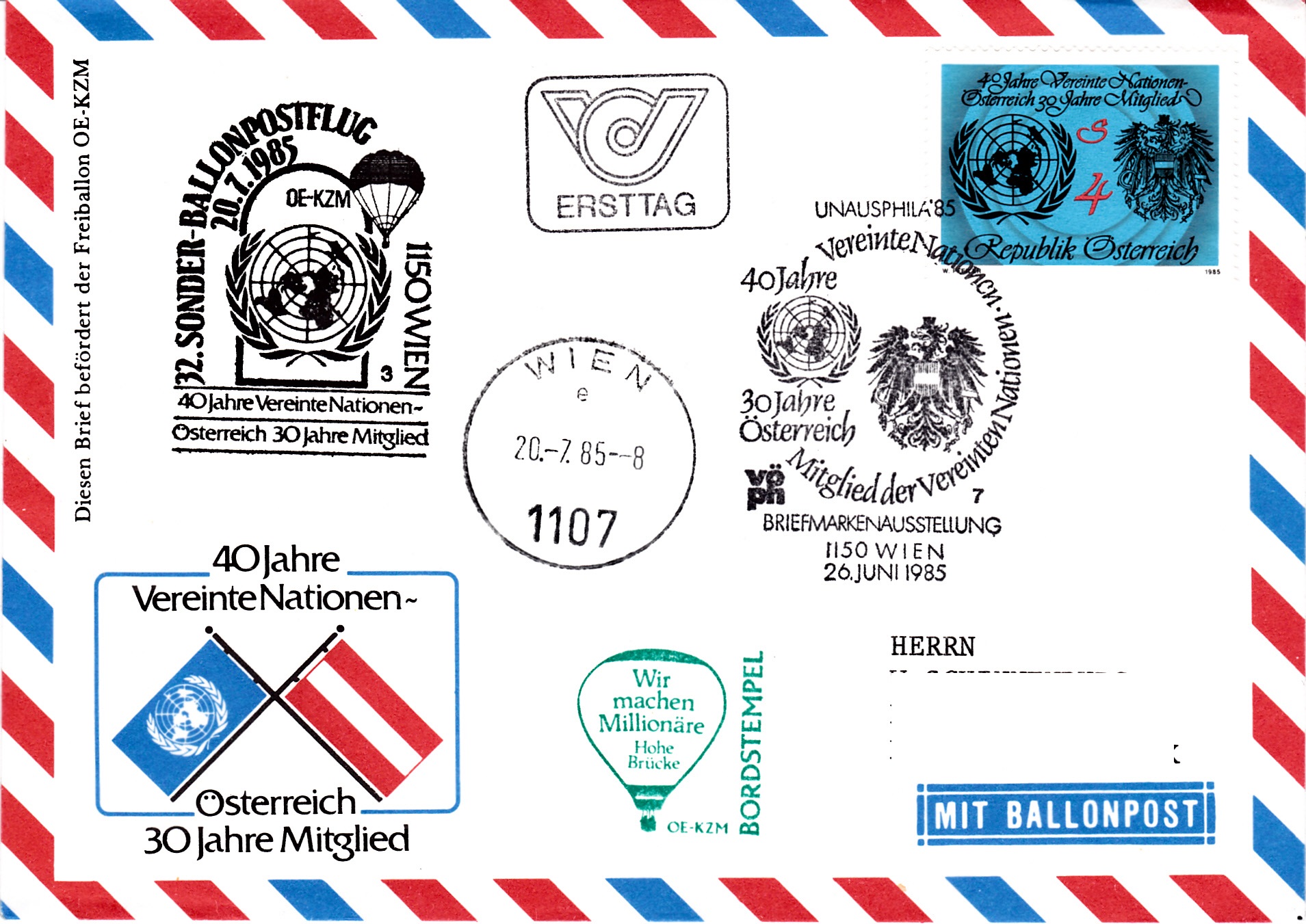 Dieser Brief wurde am Ersttag (26.6.1985) der österreichischen Marke "40 Jahre Vereinte Nationen (UNO) / 30 Jahre Mitgliedschaft Österreichs" (MiNr 1817) bei der Briefmarkenausstellung UNAUSPHILA'85 für den 32. Sonder-Ballonpostflug der Österreichischen Pro Juventute mit einem Sonderstempel zur Ausstellung mit der Kennziffer "7" gestempelt und am 20.7.1985 mit dem Freiballon OE-KZM befördert. Der Brief erhielt am 20.7.1985 einen Tagesstempel Wien, den Sonderstempel zum 32. Sonder-Ballonpostflug mit der Kennziffer "3" und einen Bordstempel.