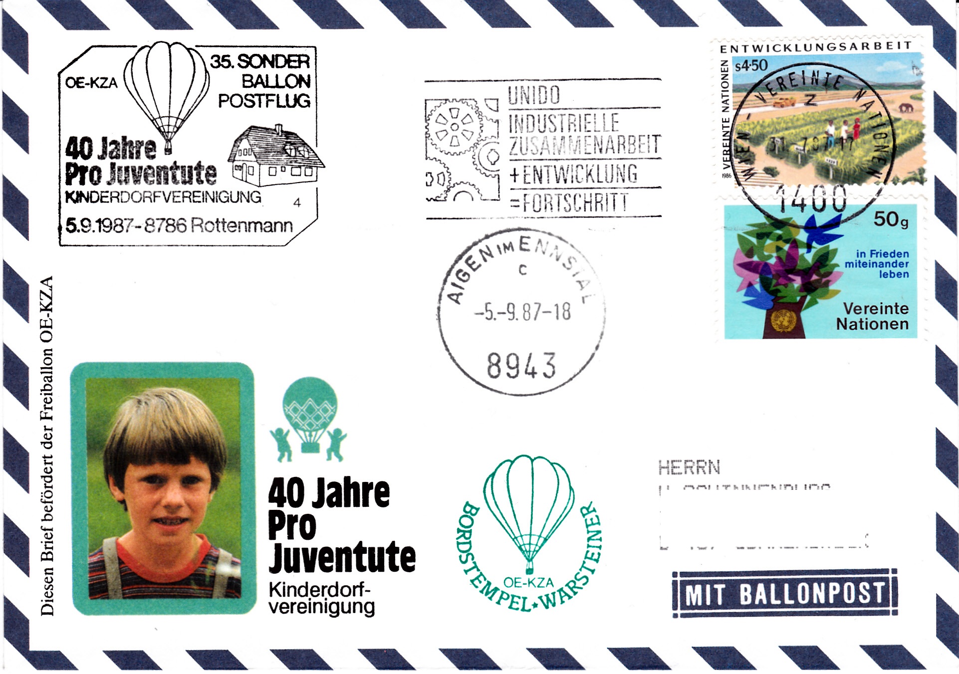 Dieser Brief wurde am 31.7.1987 bei der UN-Postverwaltung Wien für den 35. Sonder-Ballonpostflug der Österreichischen Pro Juventute aufgegeben und mit einem Maschinenstempel gestempelt. Am 5.9.1987 wurde er mit dem Freiballon OE-KZA befördert. Der Brief erhielt an diesem Tag einen Tagesstempel Aigen im Ennstal, den Sonderstempel aus Rottenmann zum 35. Sonder-Ballonpostflug mit der Kennziffer "4" und einen Bordstempel.