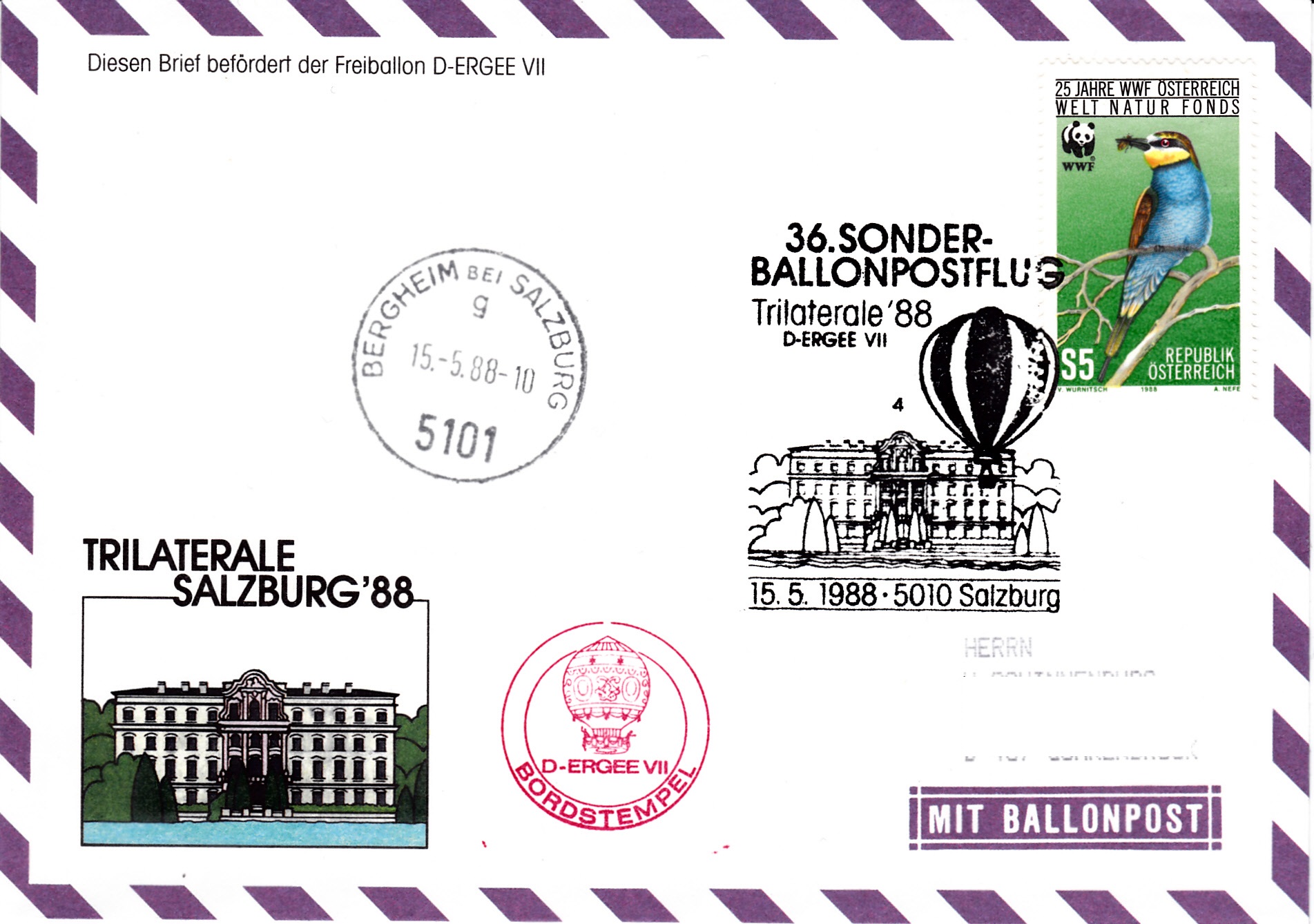 Dieser Brief wurde am 15.5.1988 bei der Briefmarkenausstellung "Trilaterale'88" für den 36. Sonder-Ballonpostflug der Österreichischen Pro Juventute mit dem Freiballon D-ERGEE VII aufgegeben. Er erhielt den Sonderstempel mit der Kennziffer "4" aus Salzburg zu diesem Ballonflug und wurde am gleichen Tag mit dem Freiballon D-ERGEE VII befördert. Der Brief erhielt noch einen Tagesstempel Bergheim bei Salzburg und einen Bordstempel.