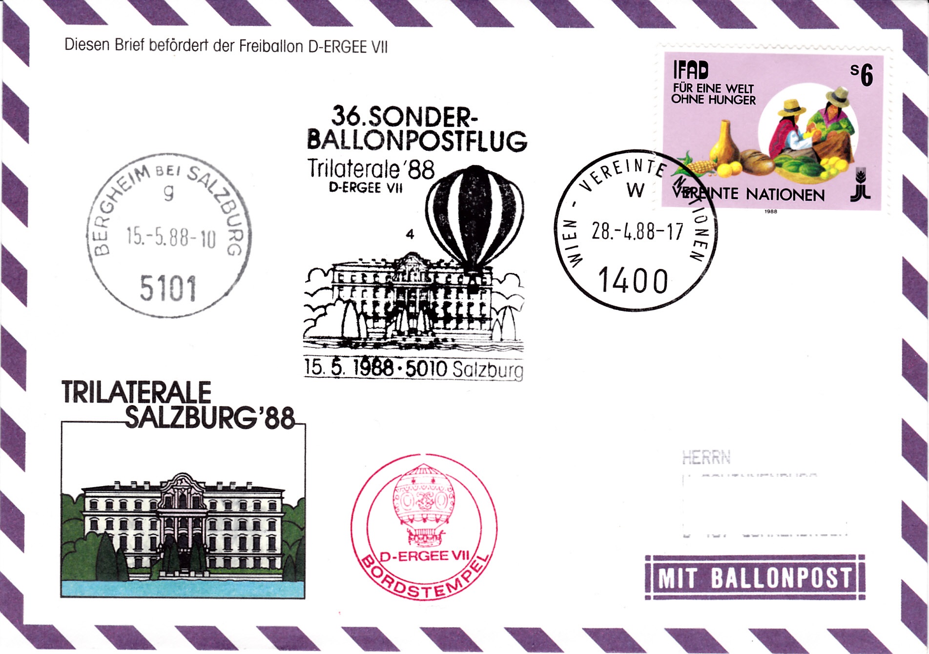 Dieser Brief wurde am 28.4.1988 bei der UN-Postverwaltung Wien für den 36. Sonder-Ballonpostflug der Österreichischen Pro Juventute mit dem Freiballon D-ERGEE VII aufgegeben und mit einem Maschinenstempel gestempelt. Der Brief erhielt am 15.5.1988 einen Tagesstempel Bergheim bei Salzburg, den passenden Sonderstempel zum 36. Sonder-Ballonpostflug bei der Briefmarkenausstellung "Trilaterale'88" mit der Kennziffer "4" und einen Bordstempel.