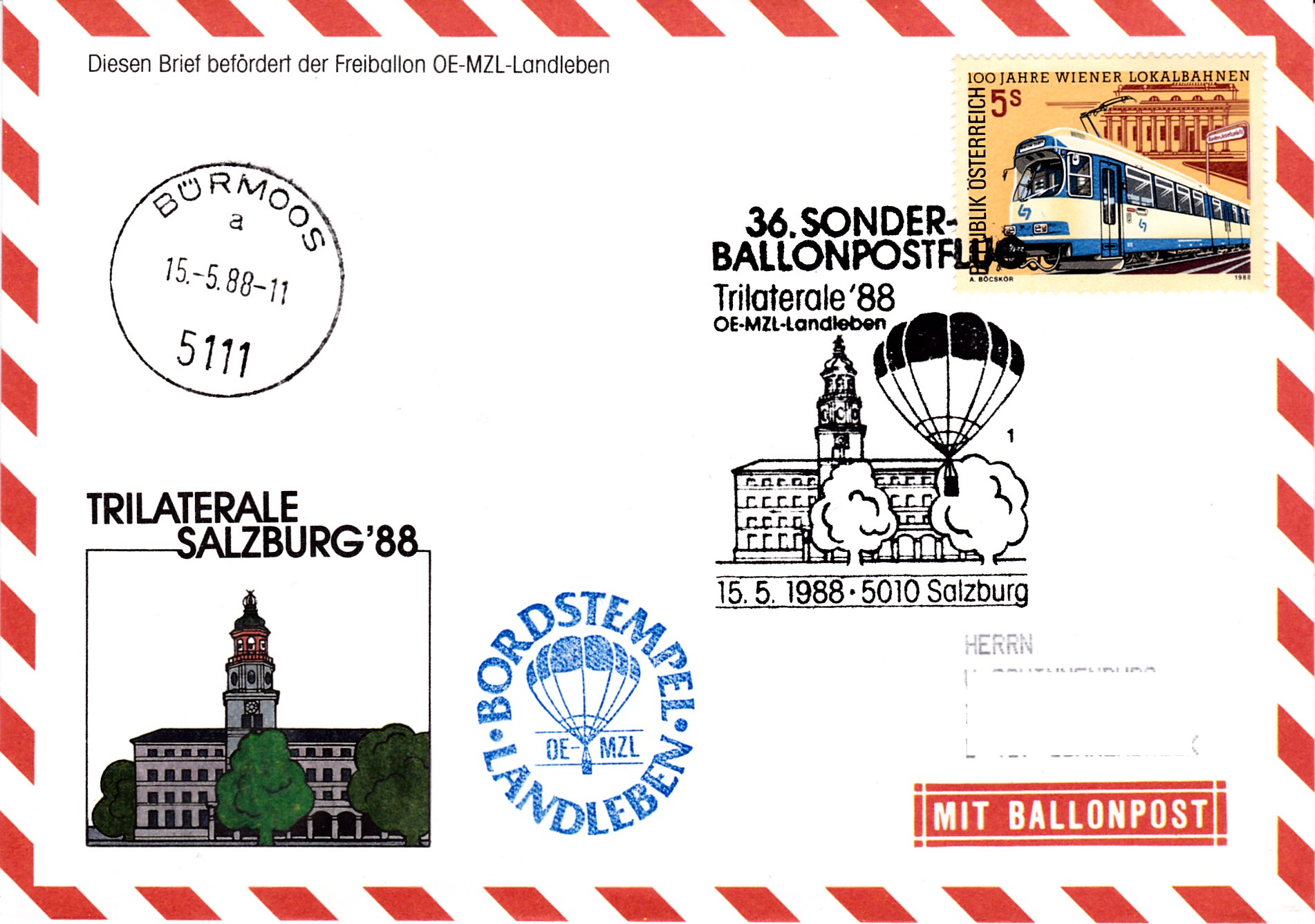 Dieser Brief wurde am 15.5.1988 bei der Briefmarkenausstellung "Trilaterale'88" für den 36. Sonder-Ballonpostflug der Österreichischen Pro Juventute mit dem Freiballon OE-MZL- Landleben aufgegeben. Er erhielt den Sonderstempel mit der Kennziffer "1" aus Salzburg zu diesem Ballonflug und wurde am gleichen Tag mit dem Freiballon OE-MZL- Landleben befördert. Der Brief erhielt noch einen Tagesstempel Bürmoos und einen Bordstempel.