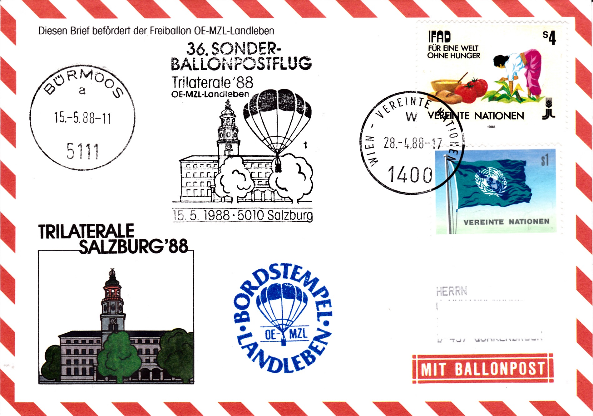 Dieser Brief wurde am 28.4.1988 bei der UN-Postverwaltung Wien für den 36. Sonder-Ballonpostflug der Österreichischen Pro Juventute mit dem Freiballon OE-MZL- Landleben aufgegeben und mit einem Maschinenstempel gestempelt. Der Brief erhielt am 15.5.1988 einen Tagesstempel Bürmoos, den passenden Sonderstempel zum 36. Sonder-Ballonpostflug bei der Briefmarkenausstellung "Trilaterale'88" mit der Kennziffer "1" und einen Bordstempel.