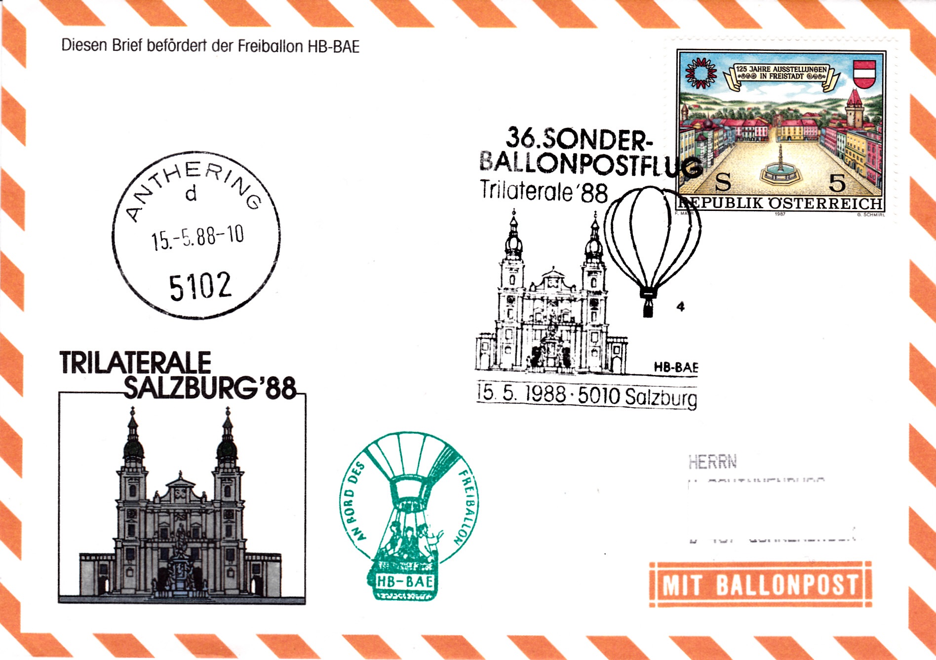 Dieser Brief wurde am 15.5.1988 bei der Briefmarkenausstellung "Trilaterale'88" für den 36. Sonder-Ballonpostflug der Österreichischen Pro Juventute mit dem Freiballon HB-BAE aufgegeben. Er erhielt den Sonderstempel mit der Kennziffer "4" aus Salzburg zu diesem Ballonflug und wurde am gleichen Tag mit dem Freiballon HB-BAE befördert. Der Brief erhielt noch einen Tagesstempel Anthering und einen Bordstempel.