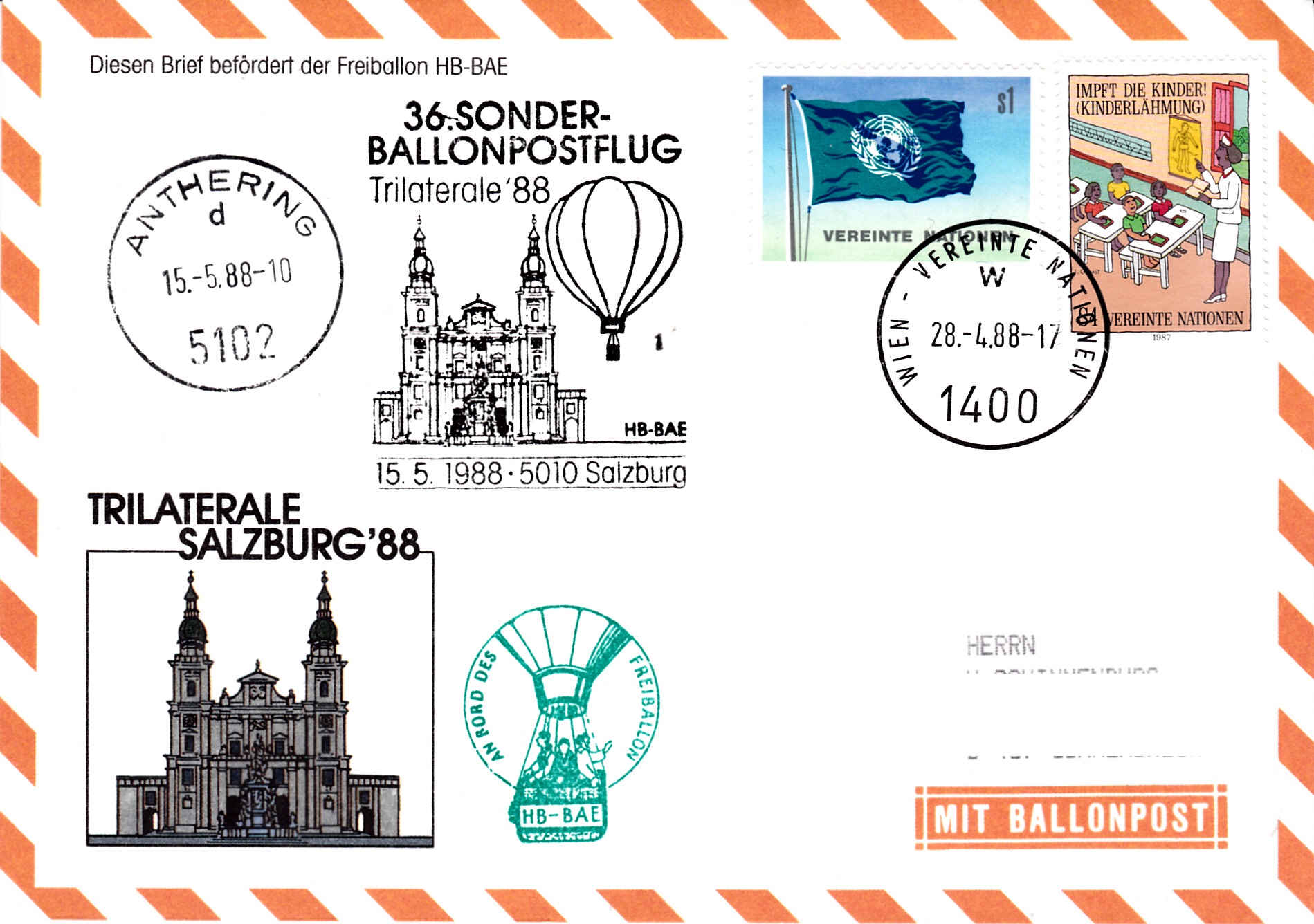 Dieser Brief wurde am 28.4.1988 bei der UN-Postverwaltung Wien für den 36. Sonder-Ballonpostflug der Österreichischen Pro Juventute mit dem Freiballon HB-BAE aufgegeben und mit einem Maschinenstempel gestempelt. Der Brief erhielt am 15.5.1988 einen Tagesstempel Anthering, den passenden Sonderstempel zum 36. Sonder-Ballonpostflug bei der Briefmarkenausstellung "Trilaterale'88" mit der Kennziffer "1" und einen Bordstempel.