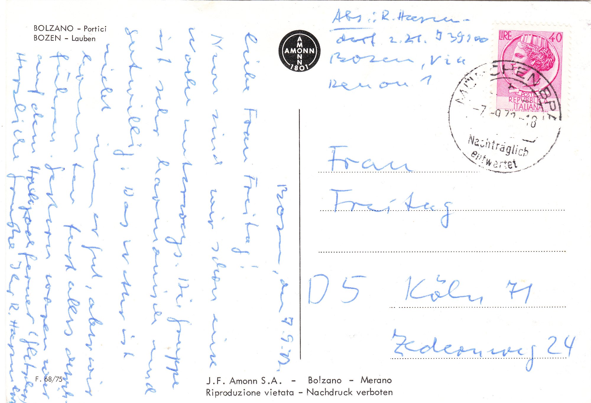 Interessant ist in diesem Zusammenhang diese Ansichtskarte nach Köln, die in Bozen in Italien am 07.09.1972 geschrieben und bei der Post aufgegeben wurde: