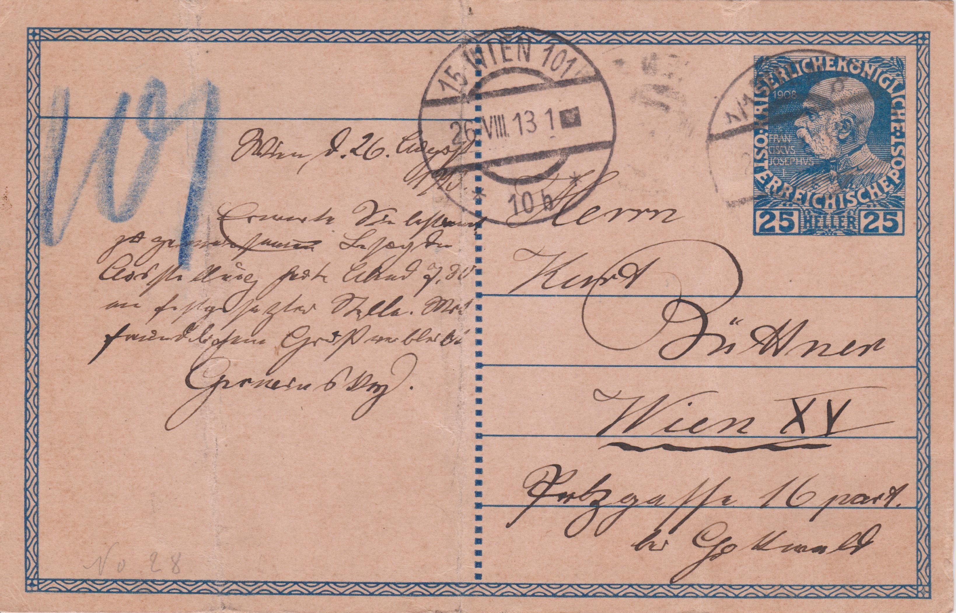 Diese Rohrpostkarte wurde am 26.08.1913 mit der Wiener Rohrpost nach WIEN 101 befördert: